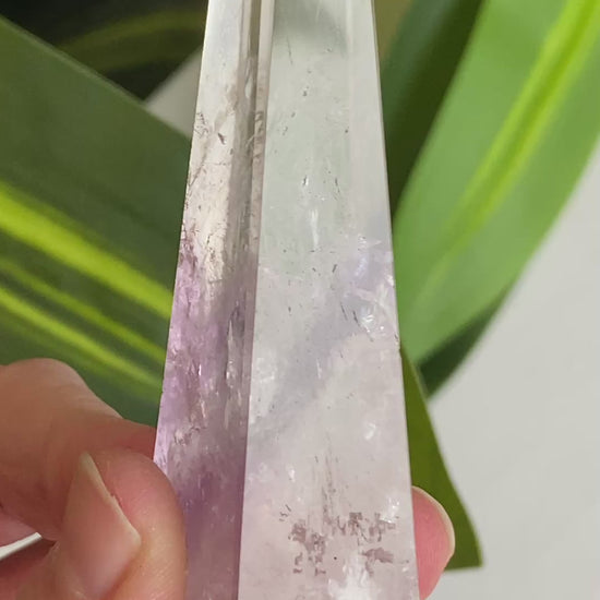 Beautiful phantom Amethyst Obelisk with wonderful clarity and defined color zoning. Elegant shape and very eye-catching in person. A step up from a basic Amethyst tower, this piece has striking coloration and the tapering obelisk shape is very well done. Looks enchanting on display. You will receive the exact Amethyst Obelisk shown. Found at the 2026 Tucson Gem Show.