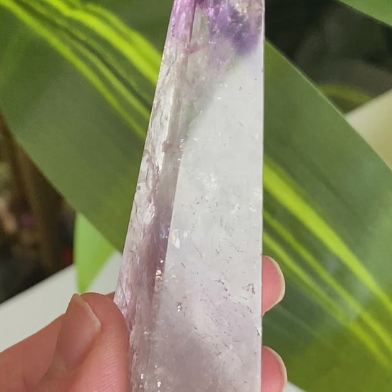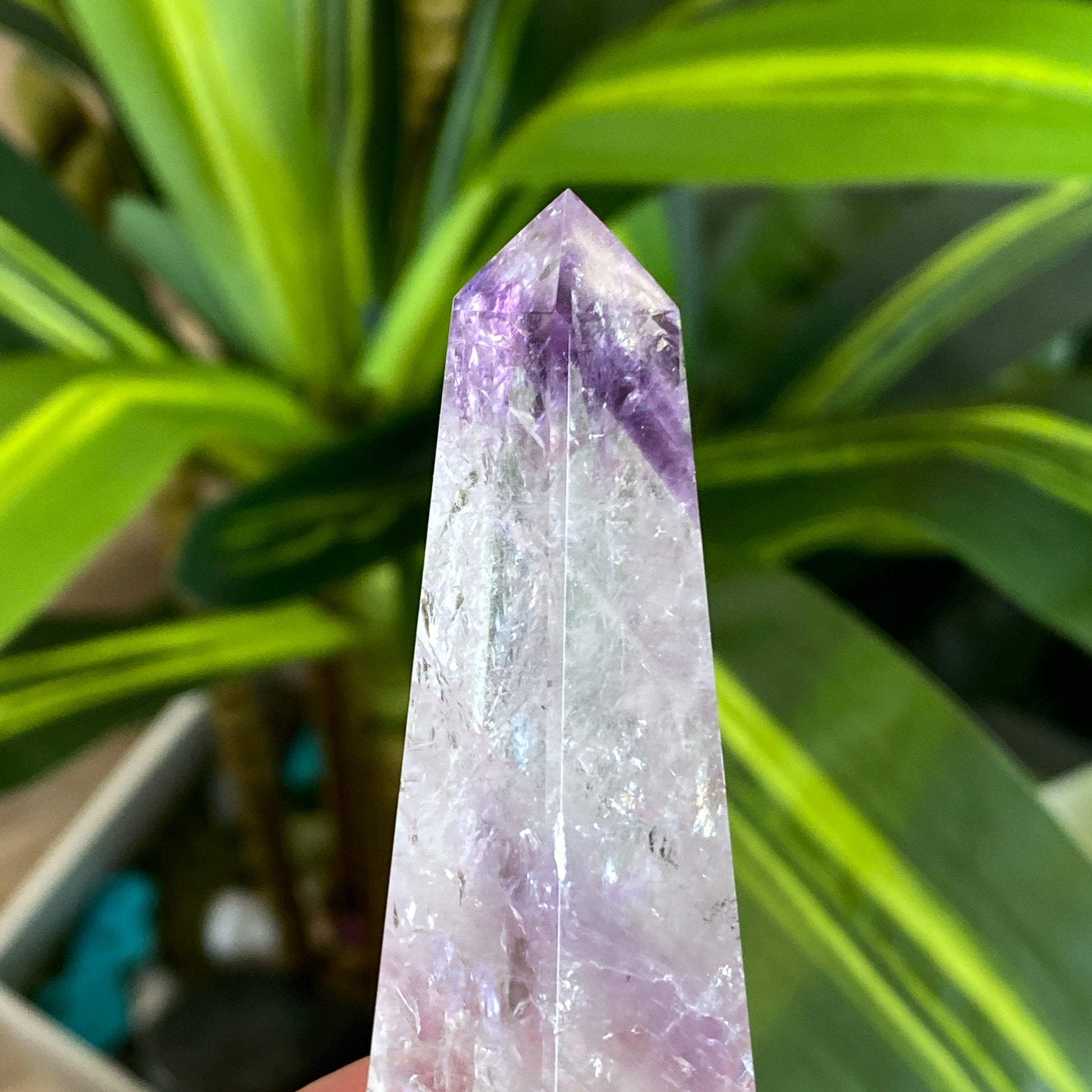 Beautiful phantom Amethyst Obelisk with wonderful clarity and defined color zoning. Elegant shape and very eye-catching in person. A step up from a basic Amethyst tower, this piece has striking coloration and the tapering obelisk shape is very well done. Looks enchanting on display. You will receive the exact Amethyst Obelisk shown. Found at the 2026 Tucson Gem Show.