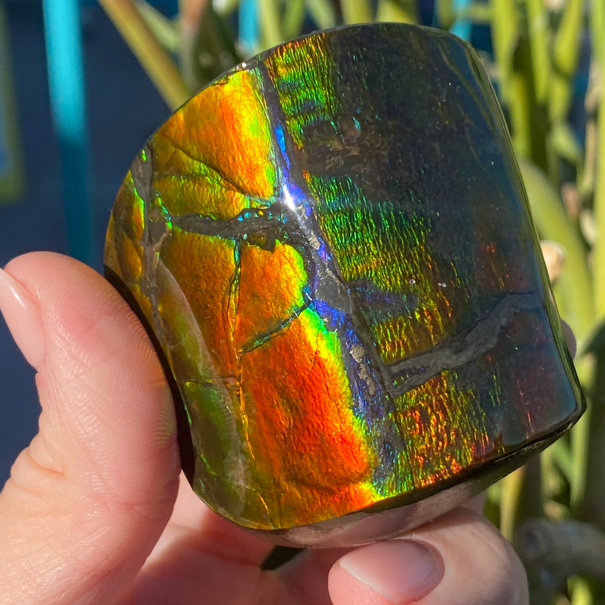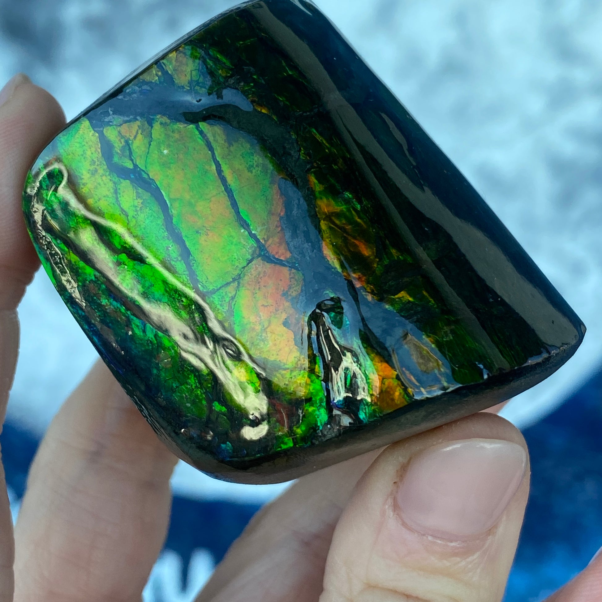 This is a flashy Ammolite specimen shaped into a freeform. A large piece. A rare and beautiful Ammolite fossil hailing from the Bearpaw Formation in Alberta. You will receive the exact Ammolite specimen shown. Excellent color range on this Ammolite including blue and violet hues. Nice sheet areas. Purchased at the 2025 Tucson Gem Show.
