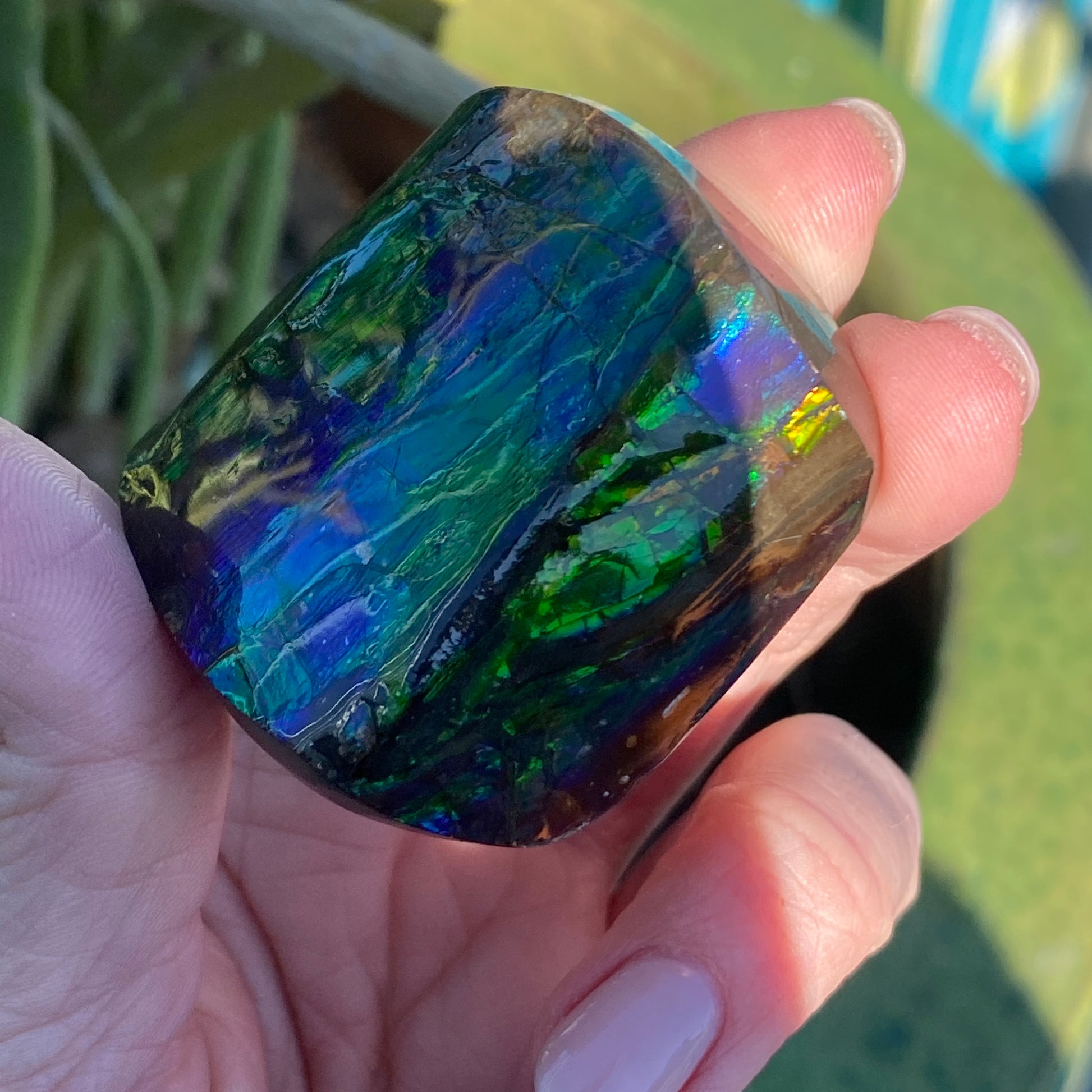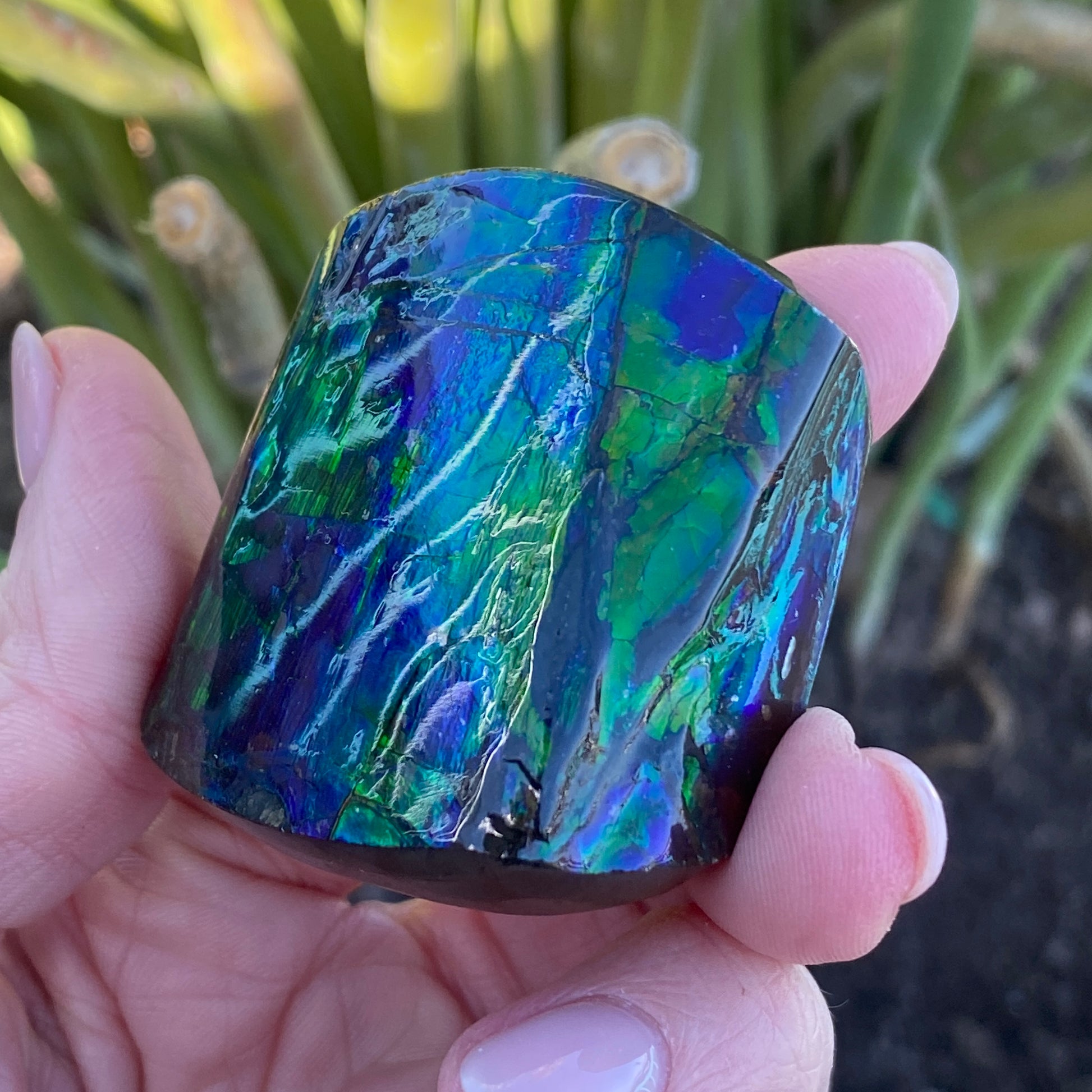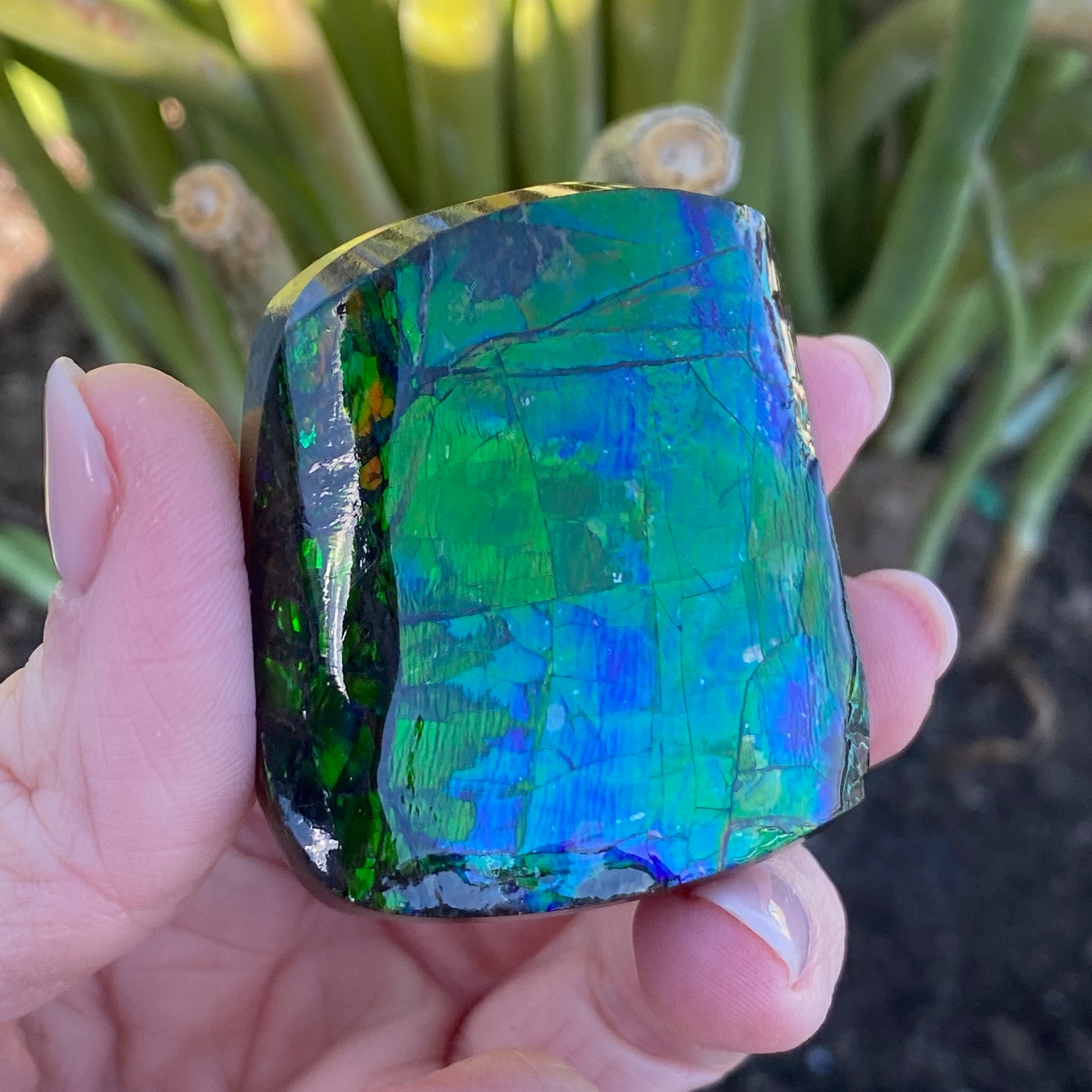This is a flashy Ammolite specimen shaped into a palmstone. A rare and beautiful Ammolite fossil hailing from the Bearpaw Formation in Alberta. You will receive the exact Ammolite specimen shown. Excellent color range on this Ammolite including blue and violet hues which are more rare. Purchased at the 2025 Tucson Gem Show.