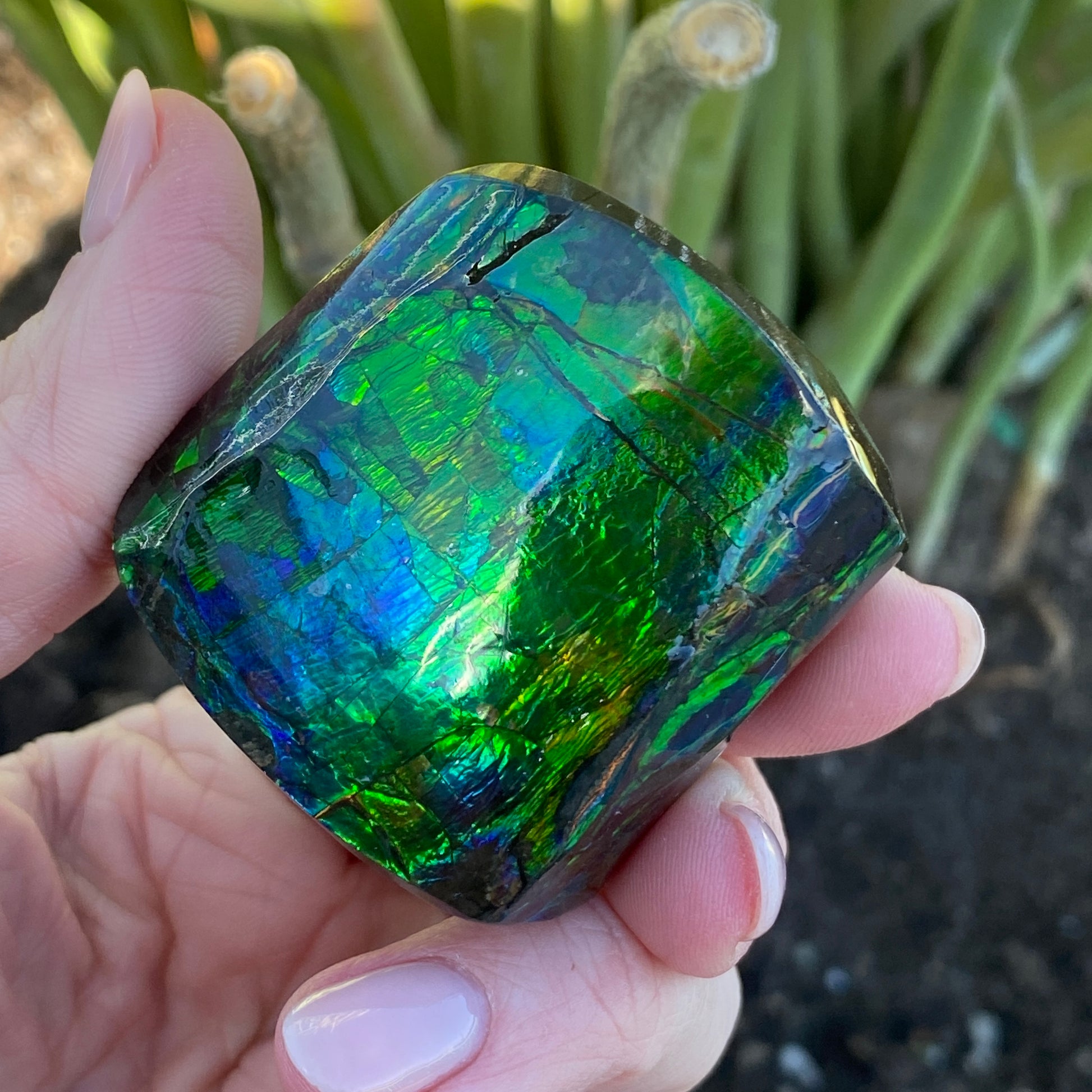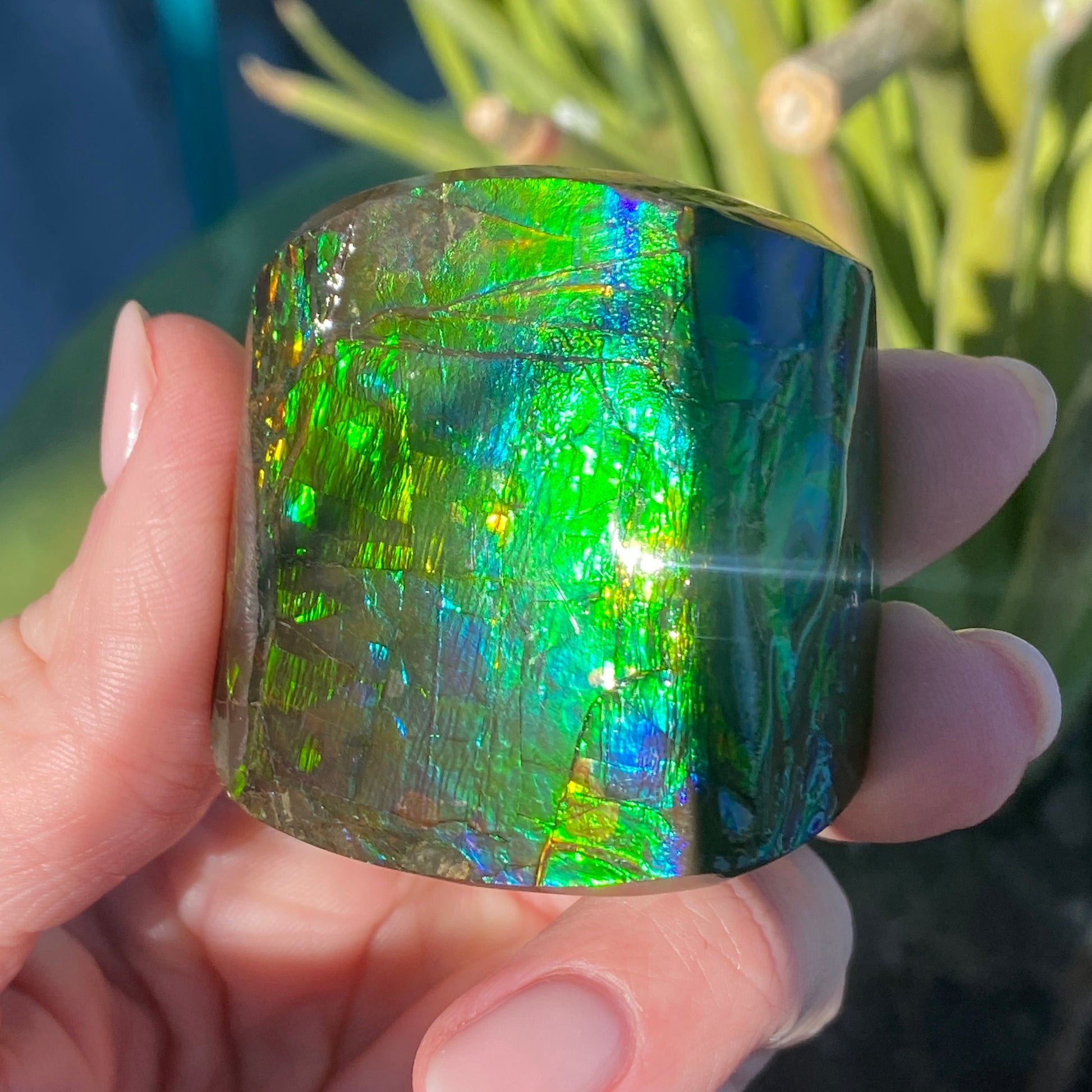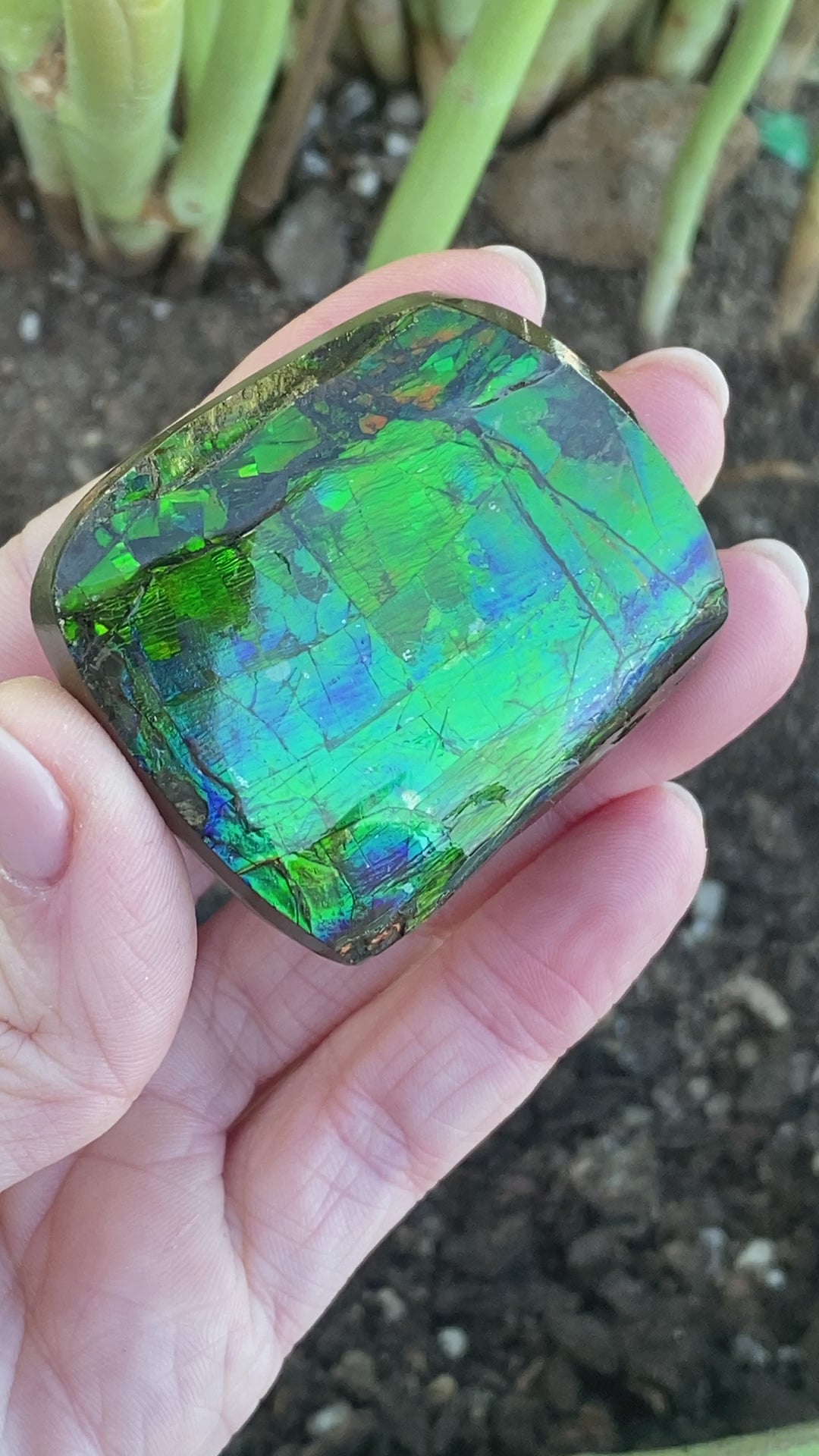 This is a flashy Ammolite specimen shaped into a palmstone. A rare and beautiful Ammolite fossil hailing from the Bearpaw Formation in Alberta. You will receive the exact Ammolite specimen shown. Excellent color range on this Ammolite including blue and violet hues which are more rare. Purchased at the 2025 Tucson Gem Show.