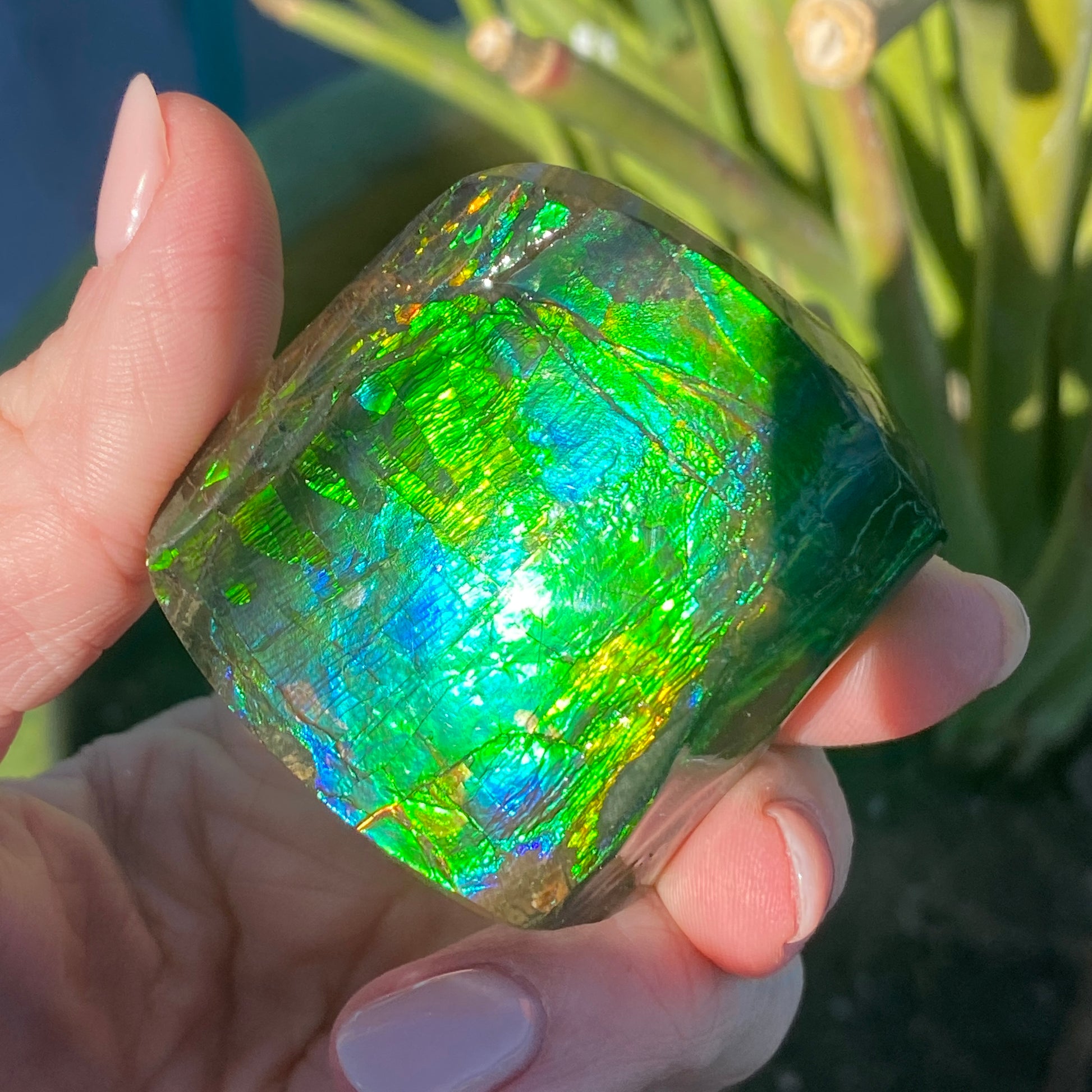 While Ammonites encapsulate the ancient energies of the Earth, Ammolite embodies the essence of the ancient heavens. Mirroring the cosmos, Ammolite is thought to help one connect to the consciousness of the primordial Universe. A stone of perfection and knowledge, Ammolites are used as a tool of transcendence and spiritual enlightenment. The multitude of colors present in Ammolite resonate with all chakras and infuse the aura with healing light.