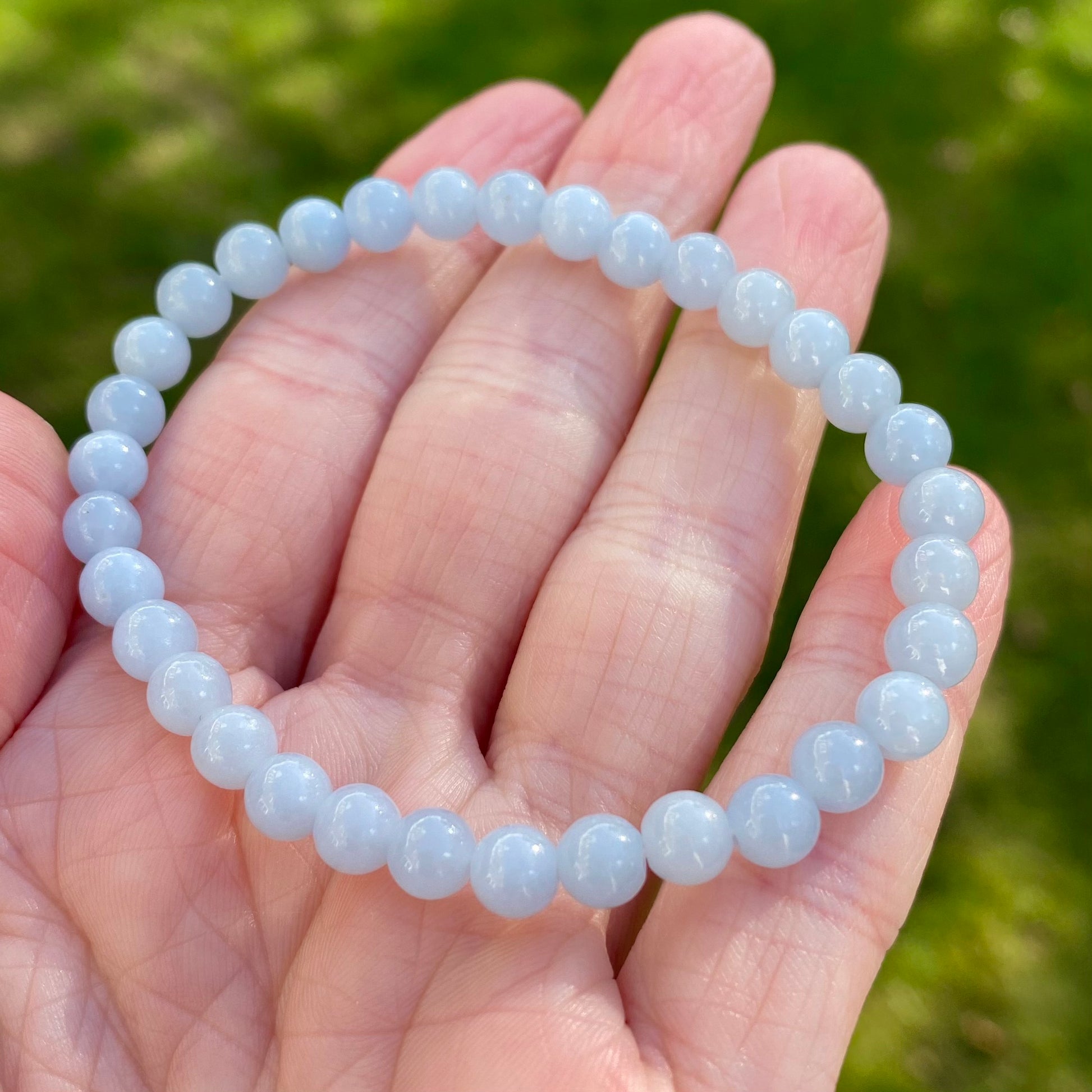This listing is for one lovely blue Angelite bracelet made with natural 6mm Angelite beads. The standard size is about 7in, which stretches to fit most adult sizes. Angelite is a stone of spiritual quests, it helps us communicate in the physical realm and with the angelic realm that surrounds us. Angelite softens the heart and opens the mind, helping us let go of tension and long-held emotional burdens. An excellent stone for speech therapists and those who care for others like nurses or teachers.