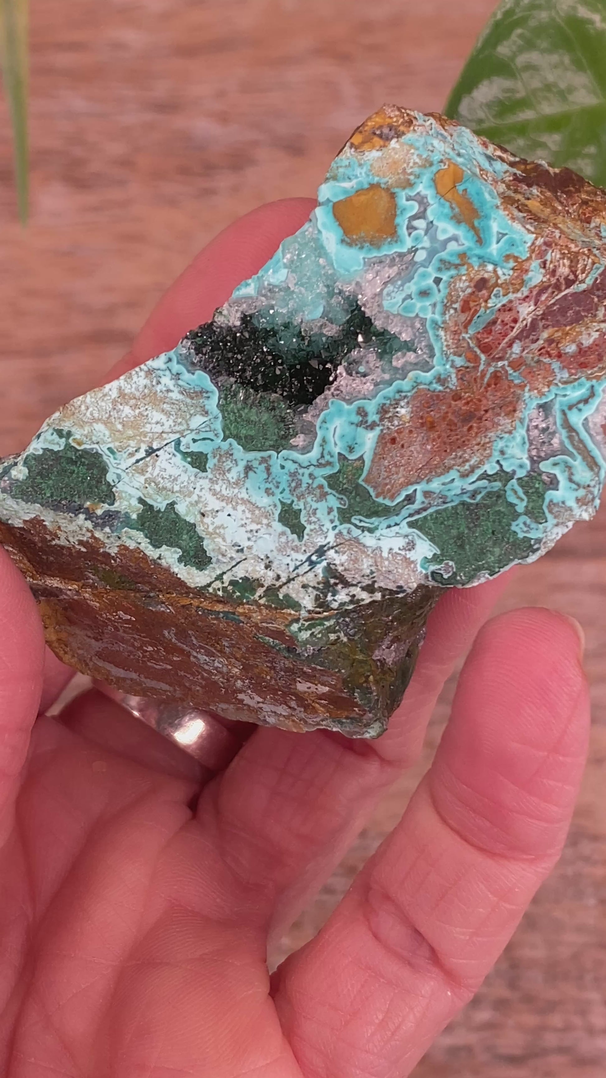 This is Atacamite, a rare mineral originally hailing from the Atacama Desert of Chile. This specimen is from Peru and combines drusy Chrysocolla and Malachite all in one beautiful specimen. A beautiful and interesting forest green crystal for your collection, you will receive the exact Atacamtie combo crystal shown. Atacamite is a copper halide mineral: a copper chloride hydroxide with the formula Cu2Cl(OH)3. It was first described for deposits in the Atacama Desert of Chile in 1801 by D. de Fallizen.