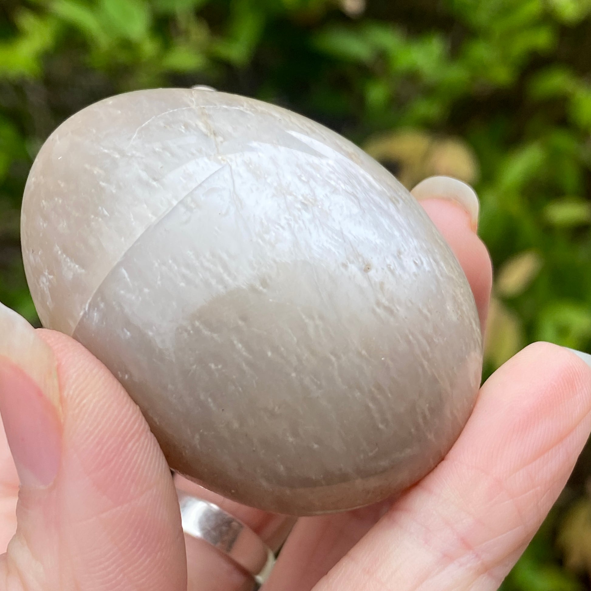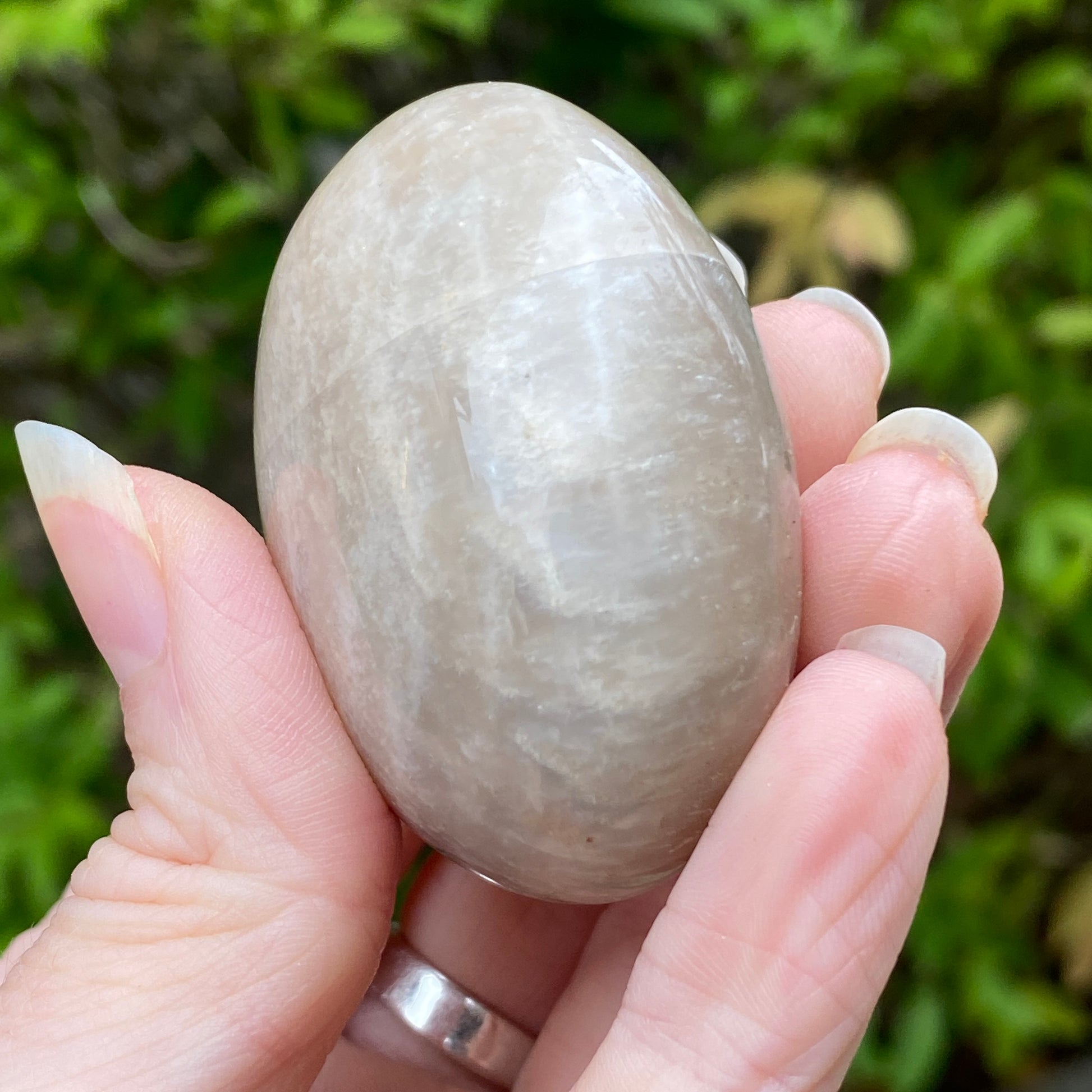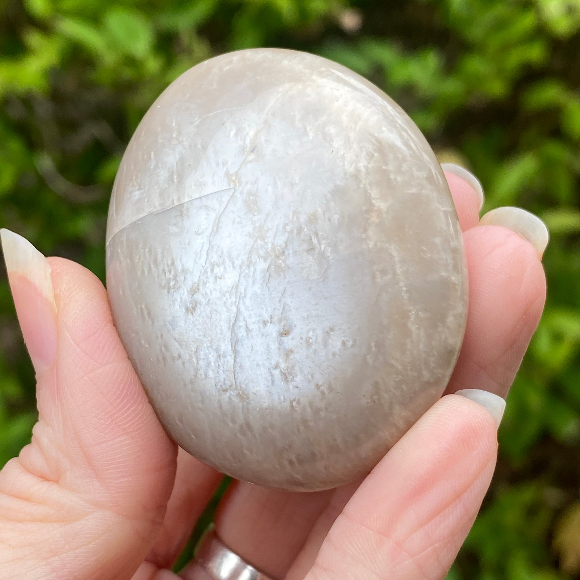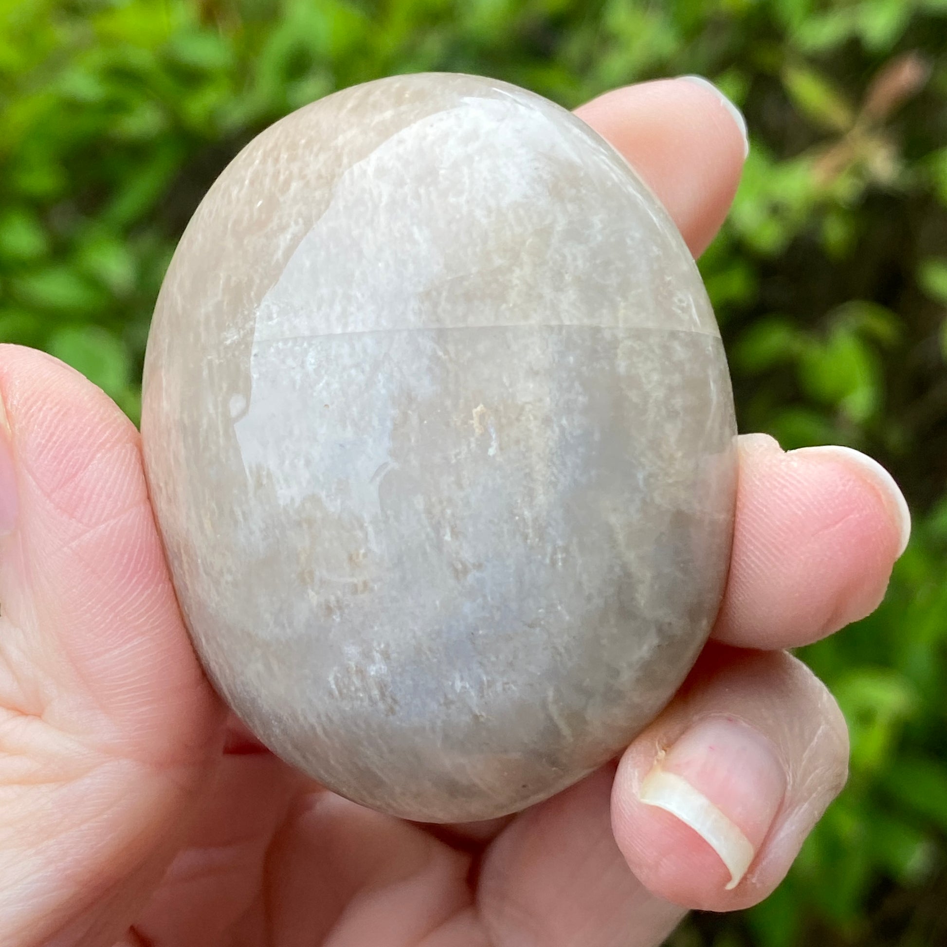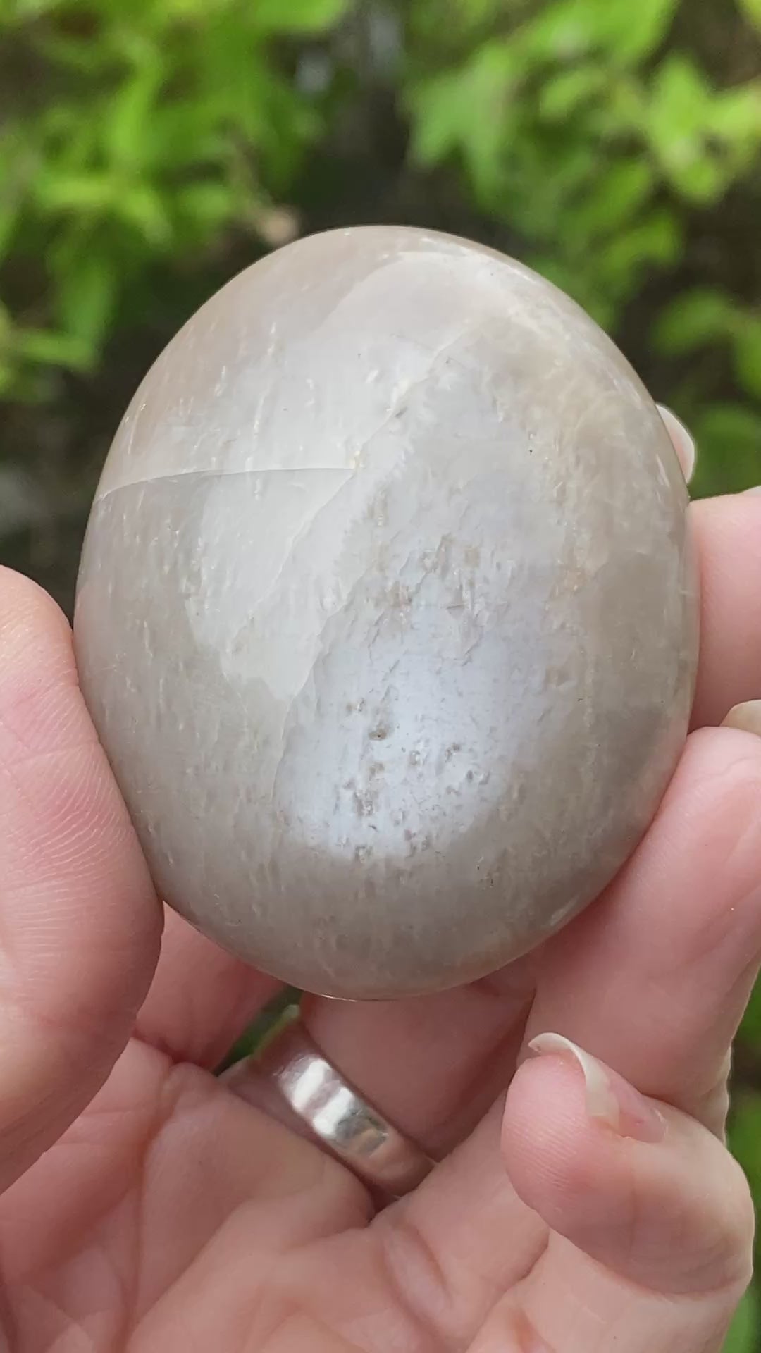 This is a beautiful, shimmering Black Moonstone palm stone with wonderful, almost pearlescent flash. Lovely and unusual coloration to this batch of Black Moonstone, I cherry picked this piece from a traditional batch of Black Moonstone. Almost looks similar to some of the newer Gray Moonstone also coming from India. This one is a peachy gray with a silvery hue. You will receive the exact Moonstone palm stone shown. Excellent shimmer.