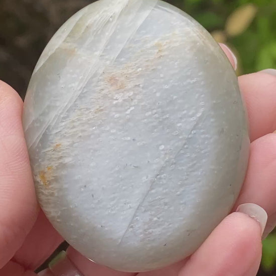 This is a beautiful, shimmering Black Moonstone palm stone with wonderful, almost pearlescent flash. Lovely and unusual coloration to this batch of Black Moonstone, I cherry picked this piece from a traditional batch of Black Moonstone. Almost looks similar to some of the newer Gray Moonstone also coming from India. This one is a silvery gray color. You will receive the exact Moonstone palm stone shown. Excellent shimmer.