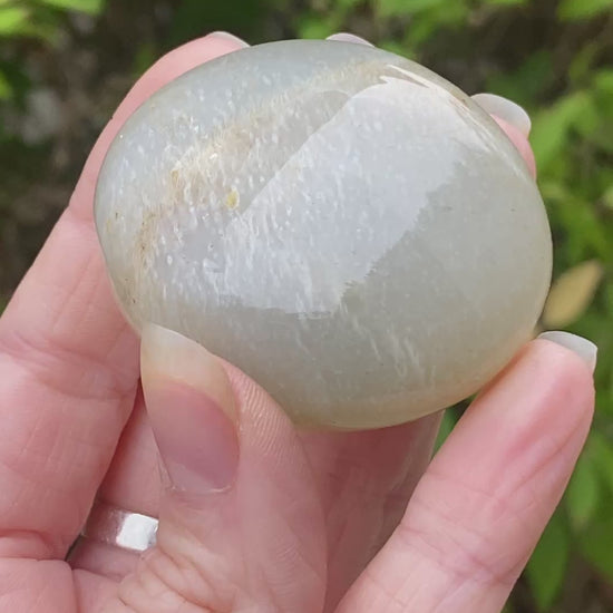 This is a beautiful, shimmering Black Moonstone palm stone with wonderful, almost pearlescent flash. Lovely and unusual coloration to this batch of Black Moonstone, I cherry picked this piece from a traditional batch of Black Moonstone. Almost looks similar to some of the newer Gray Moonstone also coming from India. This one is a silvery gray color. You will receive the exact Moonstone palm stone shown. Excellent shimmer.