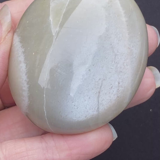 This is a beautiful, shimmering Black Moonstone palm stone with wonderful, almost pearlescent flash. Lovely and unusual coloration to this batch of Black Moonstone, I cherry picked this piece from a traditional batch of Black Moonstone. Almost looks similar to some of the newer Gray Moonstone also coming from India. This one is a silvery gray color, almost a greenish hue.. You will receive the exact Moonstone palm stone shown. Excellent shimmer.