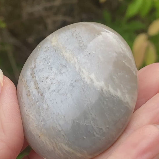 This is a beautiful, shimmering Black Moonstone palm stone with wonderful, almost pearlescent flash. Lovely and unusual coloration to this batch of Black Moonstone, I cherry picked this piece from a traditional batch of Black Moonstone. Almost looks similar to some of the newer Gray Moonstone also coming from India. This one is a silvery gray color. You will receive the exact Moonstone palm stone shown. Excellent shimmer.