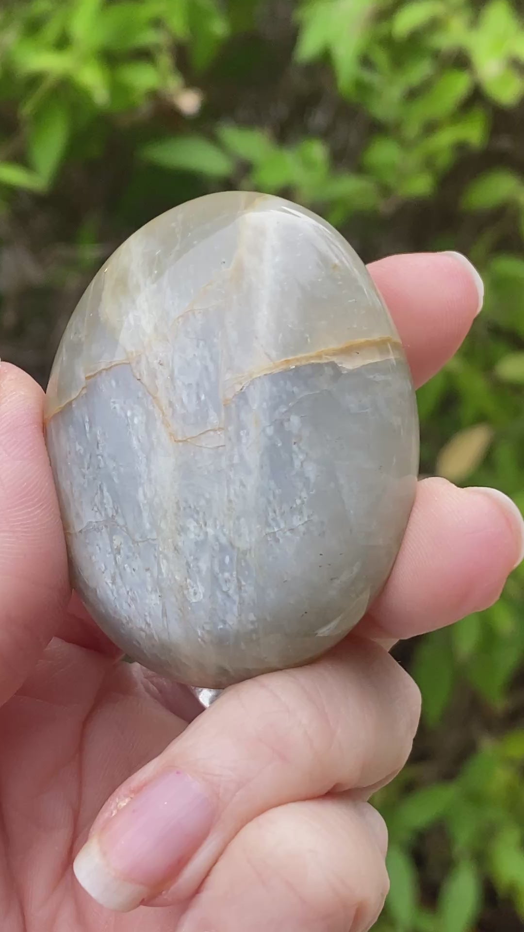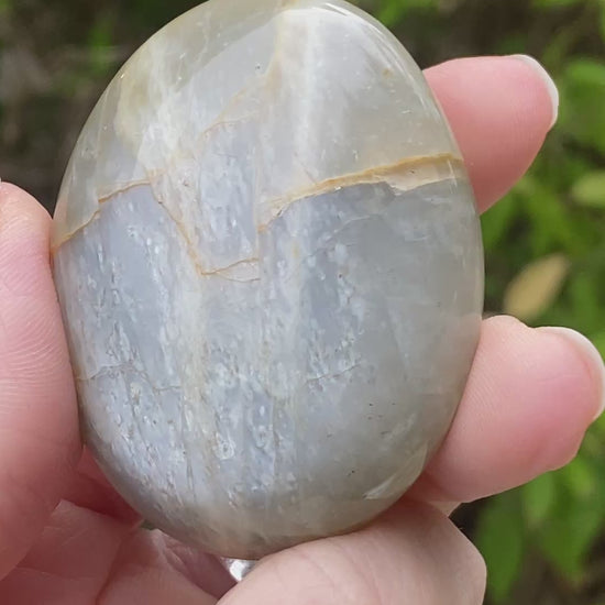 This is a beautiful, shimmering Black Moonstone palm stone with wonderful, almost pearlescent flash. Lovely and unusual coloration to this batch of Black Moonstone, I cherry picked this piece from a traditional batch of Black Moonstone. Almost looks similar to some of the newer Gray Moonstone also coming from India. This one is a silvery gray color. You will receive the exact Moonstone palm stone shown. Excellent shimmer.