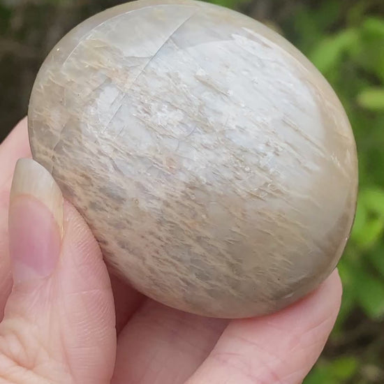 This is a beautiful, shimmering Black Moonstone palm stone with wonderful, almost pearlescent flash. Lovely and unusual coloration to this batch of Black Moonstone, I cherry picked this piece from a traditional batch of Black Moonstone. Almost looks similar to some of the newer Gray Moonstone also coming from India. This one is a warm ivory color color with a pearl and silver flash. You will receive the exact Moonstone palm stone shown. Excellent shimmer.