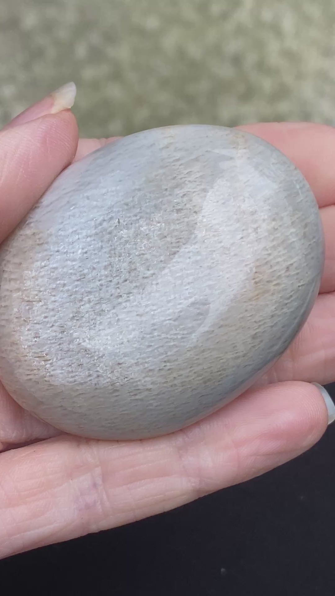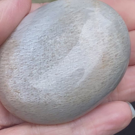 This is a beautiful, shimmering Black Moonstone palm stone with wonderful, almost pearlescent flash. Lovely and unusual coloration to this batch of Black Moonstone, I cherry picked this piece from a traditional batch of Black Moonstone. Almost looks similar to some of the newer Gray Moonstone also coming from India. This one is a warm ivory and silver gray color. You will receive the exact Moonstone palm stone shown. Excellent shimmer.