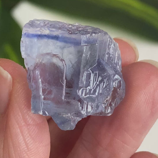 A rare find. This is a natural Blue Halite crystal hailing from Turkey with a vivid, electric blue stripe and soft blue coloring. Totally natural, no finishing. Very nice clarity, color and luster. Hard to find these in good condition. You will receive the exact piece shown. Blue halite is a rare, naturally occurring, and highly sought-after variety of sodium chloride. Natural radiation within the earth causes electrons to be trapped by sodium ions, known as "colloidal sodium". Lustrous, vivid blue specimens are most desirable for collectible purposes. Primarily sourced from Saskatchewan, Germany, and Turkey.