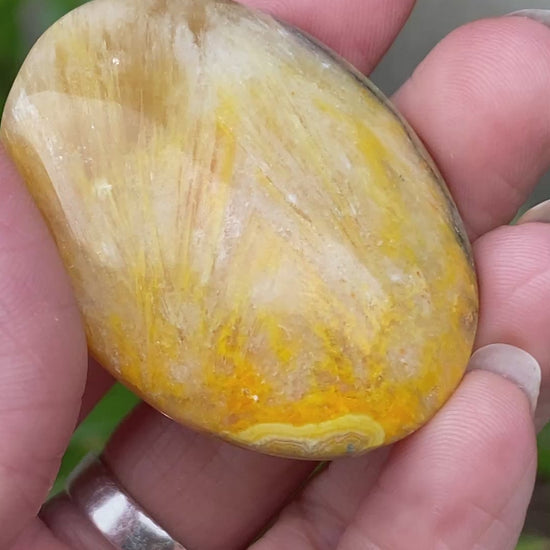 This is a vibrant Bumblebee Jasper palm stone with a smooth finish. Visible inclusions and striations of the sunny Calcite. You will receive the exact Bumblebee Jasper stone shown.
