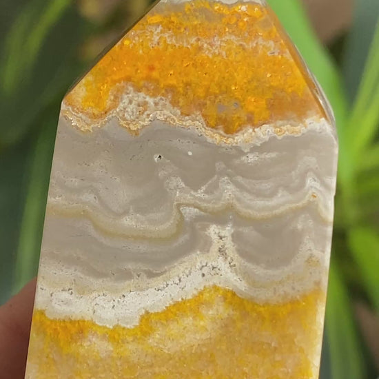 This is a natural Bumblebee Jasper tower with incredible vibrant color and wild patterns. Great price for this material. Bumblebee Jasper is the trade name for the brilliant yellow fibrous Calcite that comes from Mount Papandayan, West Java, Indonesia. Found only at Mount Papandayan, Bumblebee Jasper is born of a unique combination of geological and weather events that occur here. Discovered in 1990, this striking mineral combination consists of Calcite and a mixture of Hematite, Pyrite, and other volcanic material. In 2017, it was confirmed that the orange color is caused by Realgar. Since it contains little to no Quartz, Bumblebee Jasper is actually not a Jasper at all, but instead a fibrous Calcite with a unique mixture of volcanic minerals.
