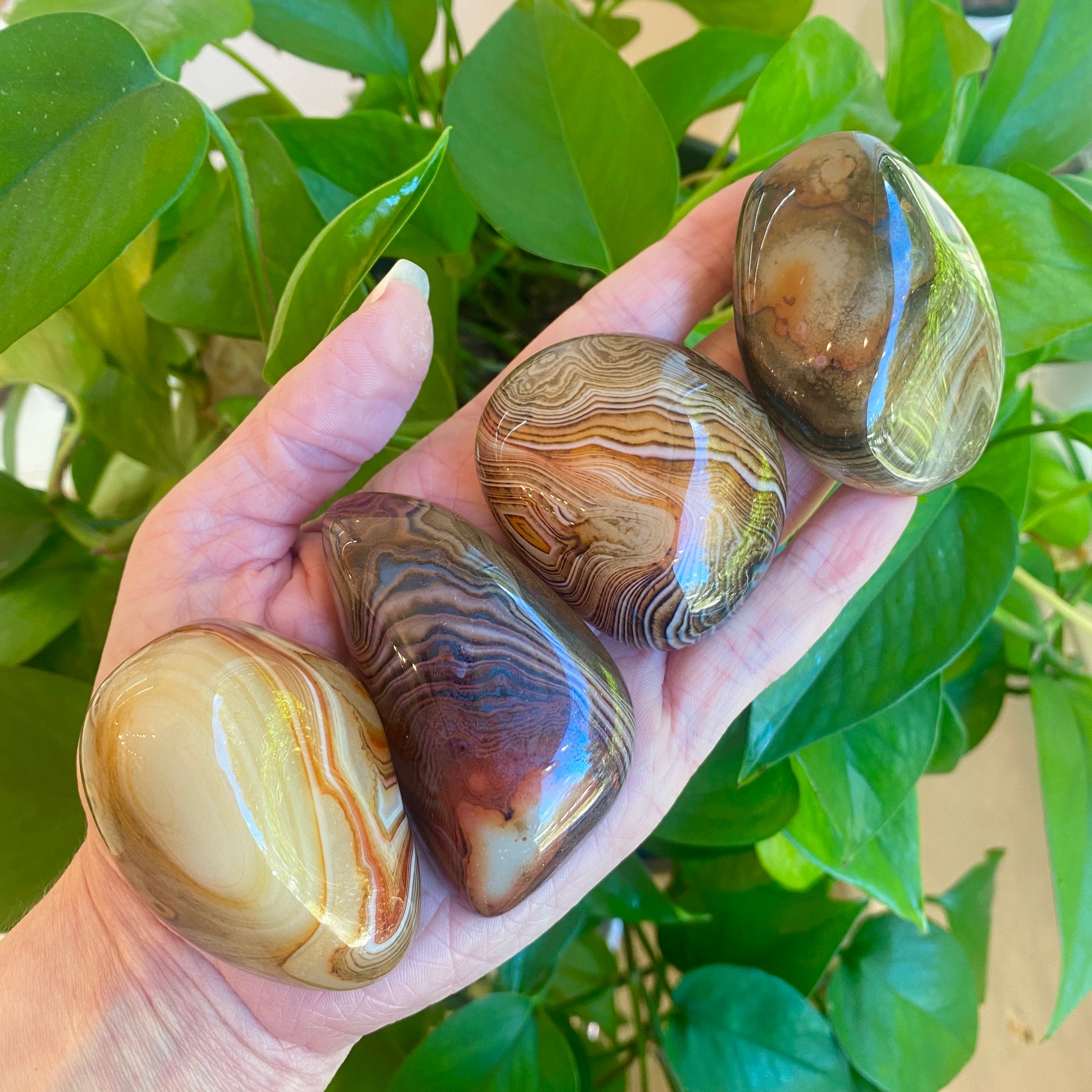 This listing is for one beautiful Carnelian Sardonyx stone like shown. I've carefully selected each one of these for their wild patterns and banding so they are all equally amazing. This is Brazilian Sardonyx which is a form of banded Chalcedony. Carnelian is an orange or red variety of Chalcedony which is why this is called Carnelian Sardonyx because of the hints of orange throughout. A wonderful grounding and revitalizing stone, it blends Earth, fire and water energies together for a complex but relaxing vibe. Each stone is so unique and has its own energy, but in general, Carnelian Sardonyx is a stone supporting the root and sacral chakras. It brings joy, renewed optimism and resilience.