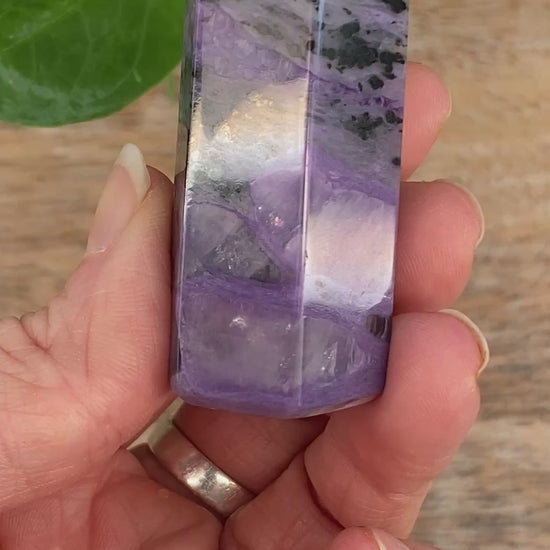 This is a wonderful, natural Charoite tower with lots of details to explore. Black Aegirine swirls around the top and little translucent spots towards the bottom. Inclusions of Tinaksite and Aegirine.Tinaksite is the pale brown, shimmery material; the Aegirine appears black. Charoite is an exceptionally rare and beautiful stone beloved by collectors and healers. Hand-carved and polished from natural Charoite, this special tower will make a beautiful addition to any collection. You will receive the exact Charoite shown.