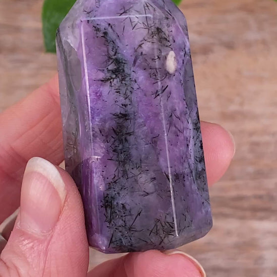 This is a wonderful, natural Charoite tower with lots of details to explore. Interesting display of Aegirine in this piece; defined crystals are dispersed throughout. Charoite is an exceptionally rare and beautiful stone beloved by collectors and healers. Hand-carved and polished from natural Charoite, this special tower will make a beautiful addition to any collection. You will receive the exact Charoite shown.