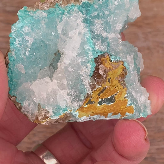 This is a natural Chrysocolla in Quartz specimen hailing from Peru. It has a vibrant teal color and is a great price for the size. Chrysocolla helps us turn our thoughts into words and our words into actions. Chrysocolla encourages spontaneity, physical activity, laughter and saying ‘yes’ more often. The vibrant spark of Chrysocolla can ignite our passions and let us pursue our own happiness without apology. Chrysocolla is a stone of the Goddess, teacher and unification of the base, heart and throat chakras.