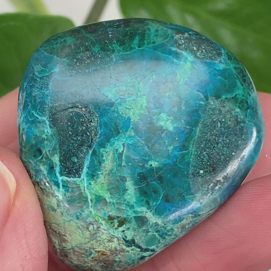 Vibrant, large Chrysocolla Stone. You will receive the exact Chrysocolla shown. Large for a tumble, like a mini freeform. Hand-polsihed. Chrysocolla is a hydrated copper silicate mineral that often forms as blue to greenish-blue crusts or veins in copper ore deposits. It is named after the Greek words for "gold" and "glue" due to its historical use as a flux in soldering gold. A stone of the goddess and teacher. Chrysocolla is associated with communication, empowerment, and emotional healing. It promotes honest expression, inner strength, and compassion. Chrysocolla also facilitates self-awareness, balance, and harmony with nature. Associated with music and sound.