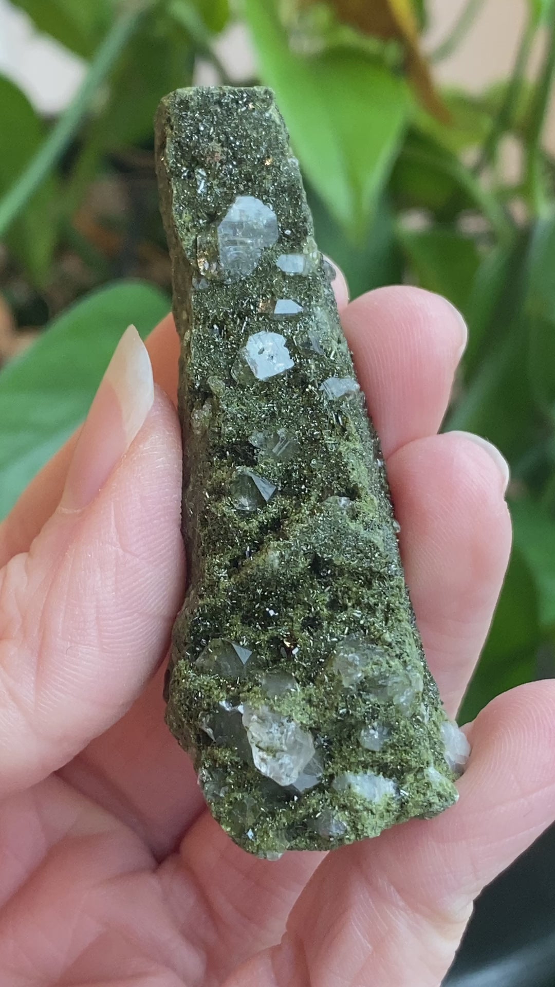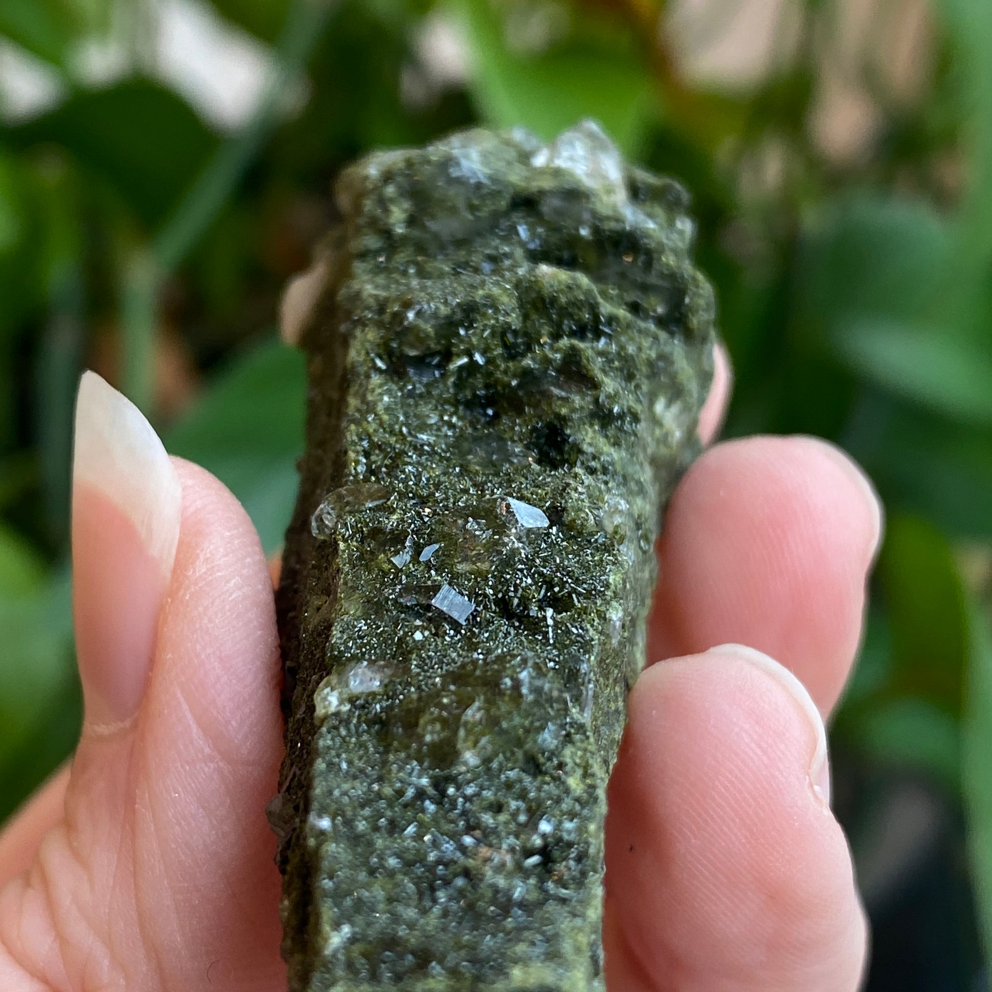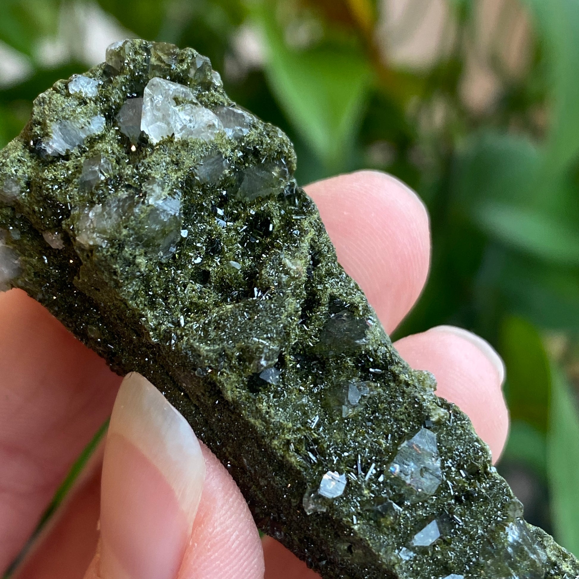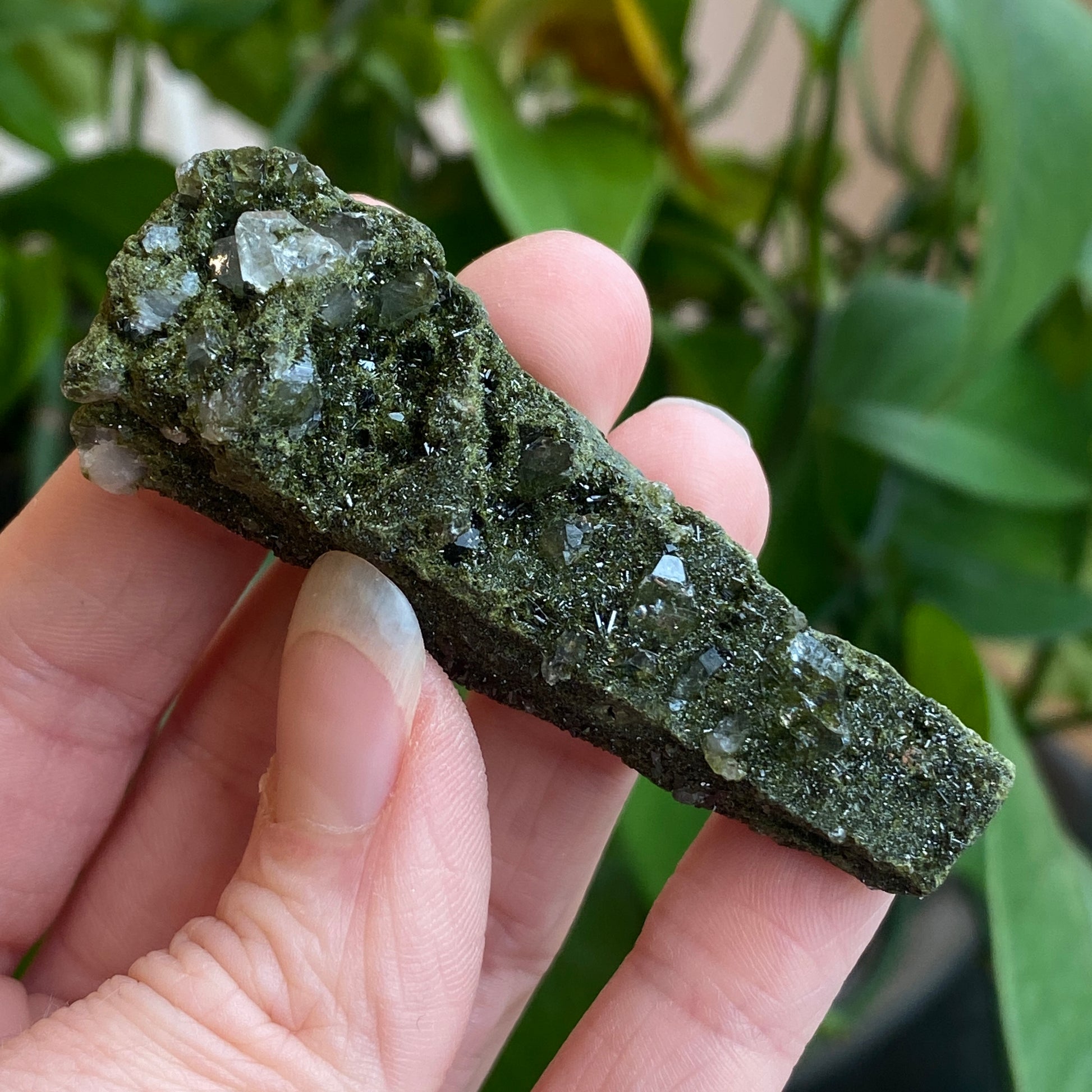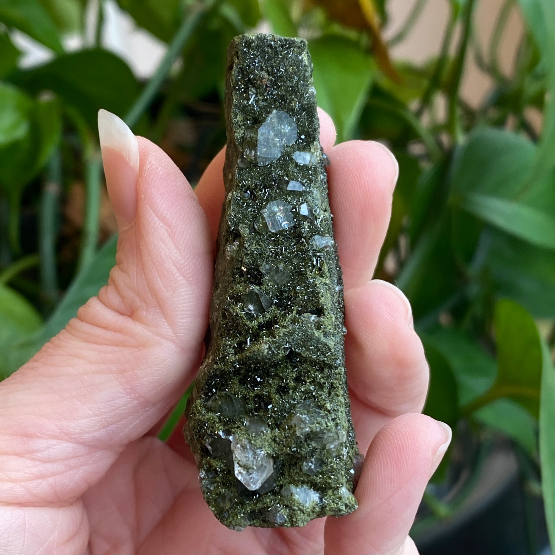 New Deposit! A beautiful Epidote Crystal on Quartz specimen from Turkey. A newer deposit with very fine Epidote crystals coating Quartz. Sparkling and lovely! You will receive the exact Epidote crystal shown. Epidote is a semi-precious gemstone associated with laws of attraction, manifestation, abundance, and vitality. A powerful Earth energy stone.