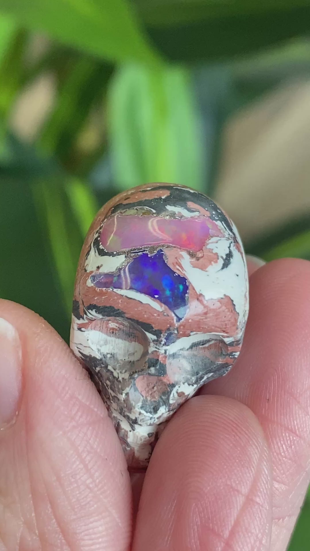 A unique find, this is a hand carved skull featuring a section of flashy opal surrounded by the original matrix. You will receive the exact skull shown. From the Tucson gem show 2026.