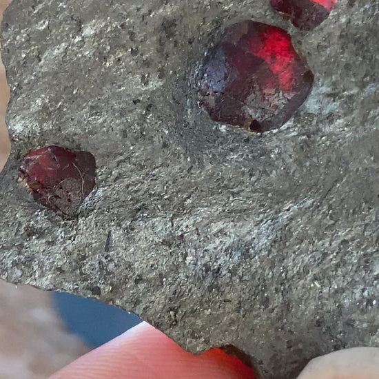 Garnet in Graphite Specimen. This is an unusual find from the Red Embers Mine in Erving Massachusetts. This location is currently only mined by one individual who puts an incredible amount of care into perfectly extracting and cleaning these plates of Garnets. They are Almandine Garnets in a Graphite matrix. When backlit, these glow an awesome red color. Very otherworldly! The miner only does one show per year making availability very limited. A one-of-a-kind and collectible find!