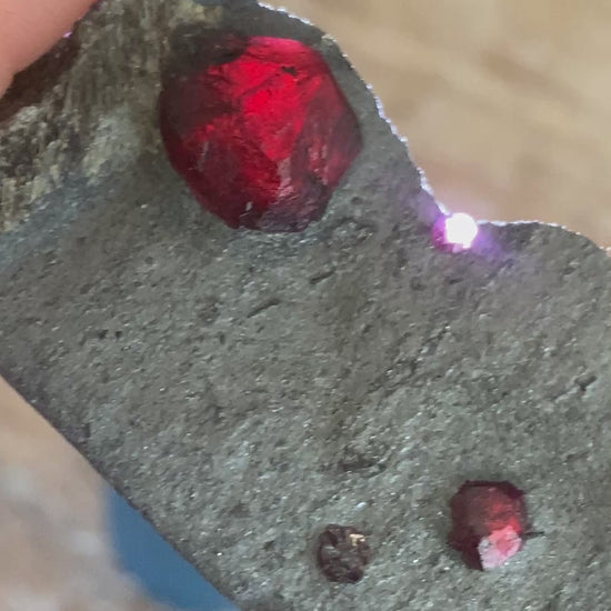 Garnet in Graphite Specimen. This is an unusual find from the Red Embers Mine in Erving Massachusetts. This location is currently only mined by one individual who puts an incredible amount of care into perfectly extracting and cleaning these plates of Garnets. They are Almandine Garnets in a Graphite matrix. When backlit, these glow an awesome red color. Very otherworldly! The miner only does one show per year making availability very limited. A one-of-a-kind and collectible find!