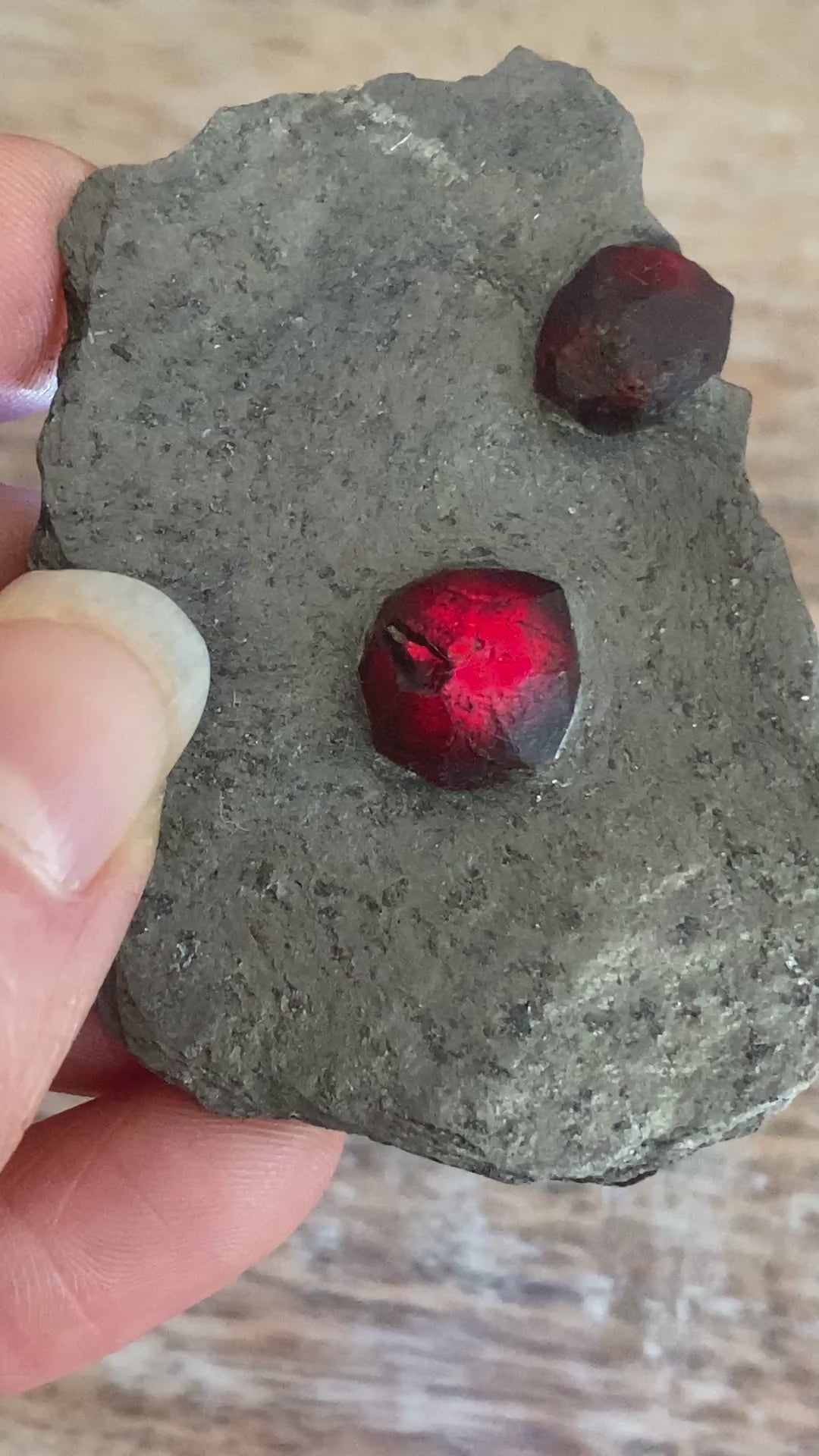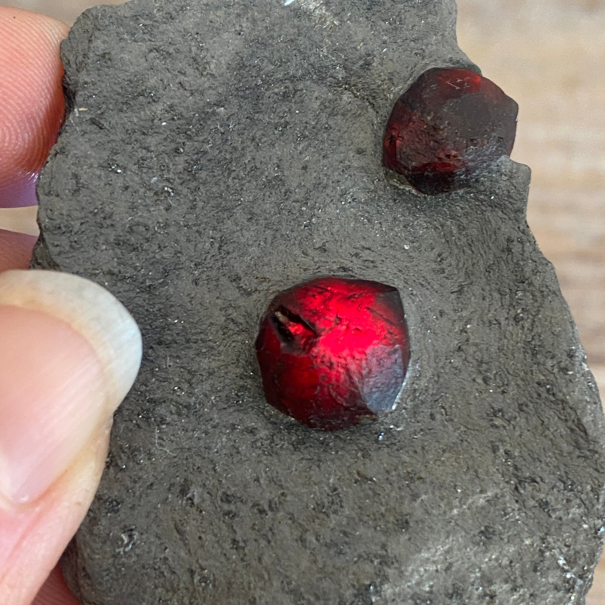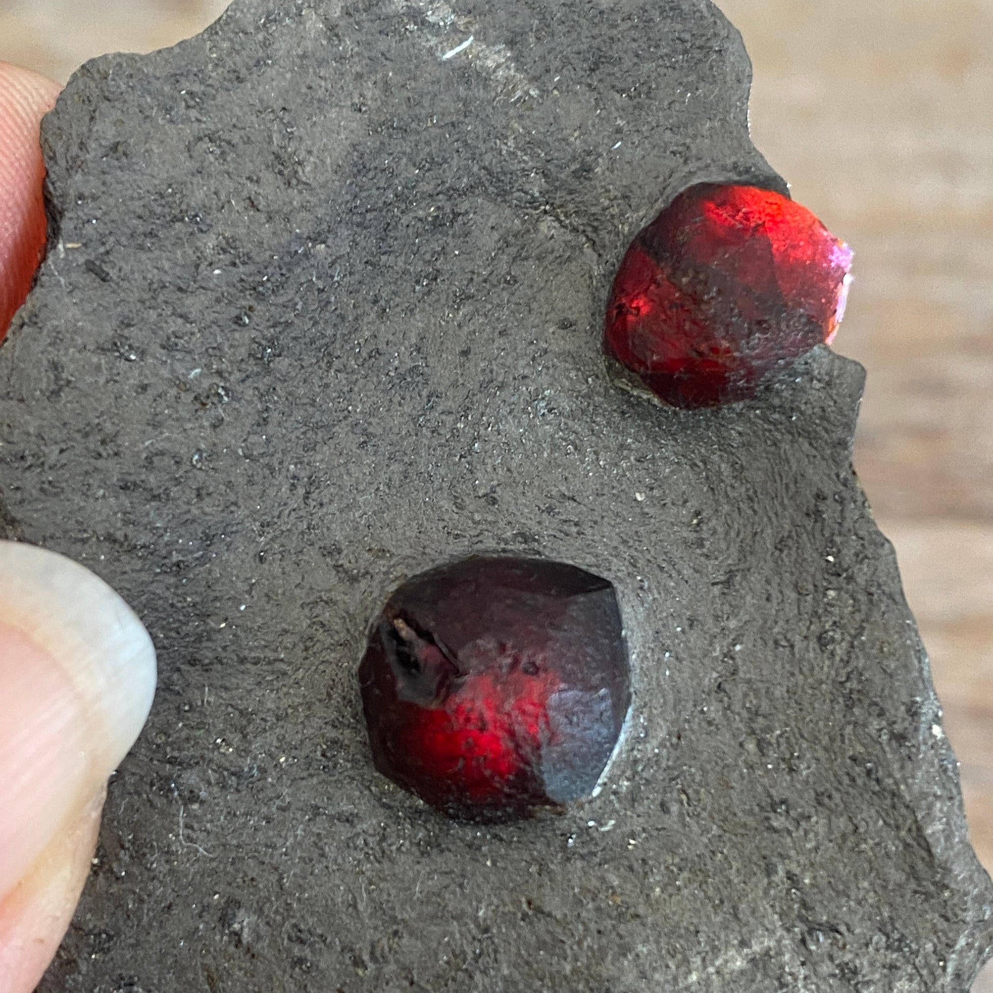 Garnet in Graphite Specimen. This is an unusual find from the Red Embers Mine in Erving Massachusetts. This location is currently only mined by one individual who puts an incredible amount of care into perfectly extracting and cleaning these plates of Garnets. They are Almandine Garnets in a Graphite matrix. When backlit, these glow an awesome red color. Very otherworldly! The miner only does one show per year making availability very limited. A one-of-a-kind and collectible find!