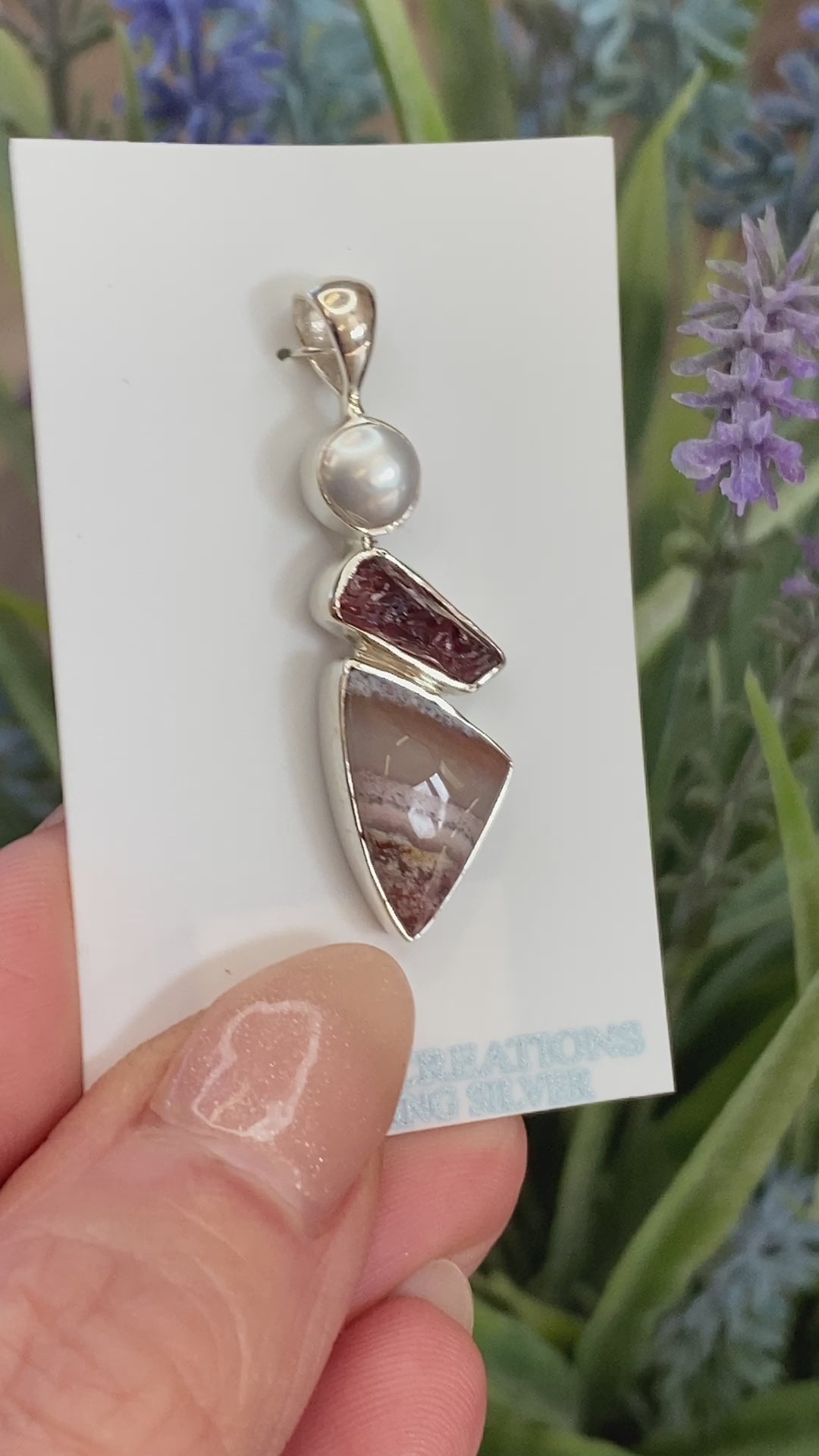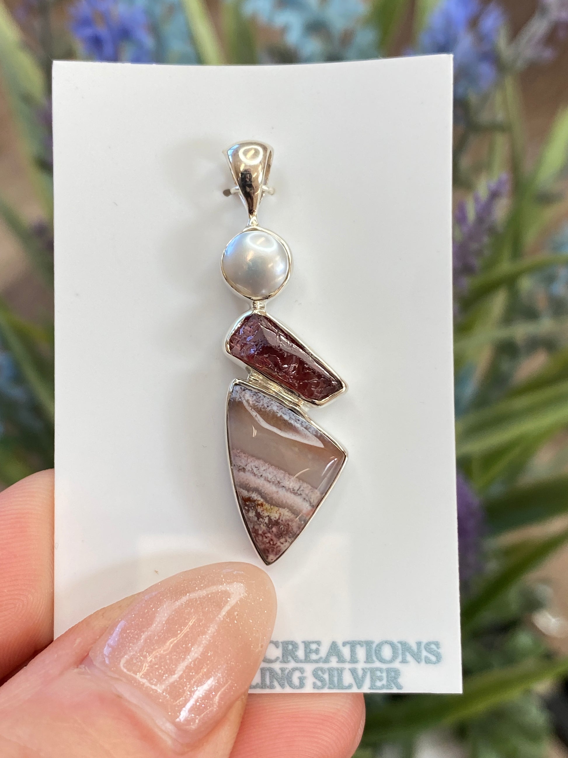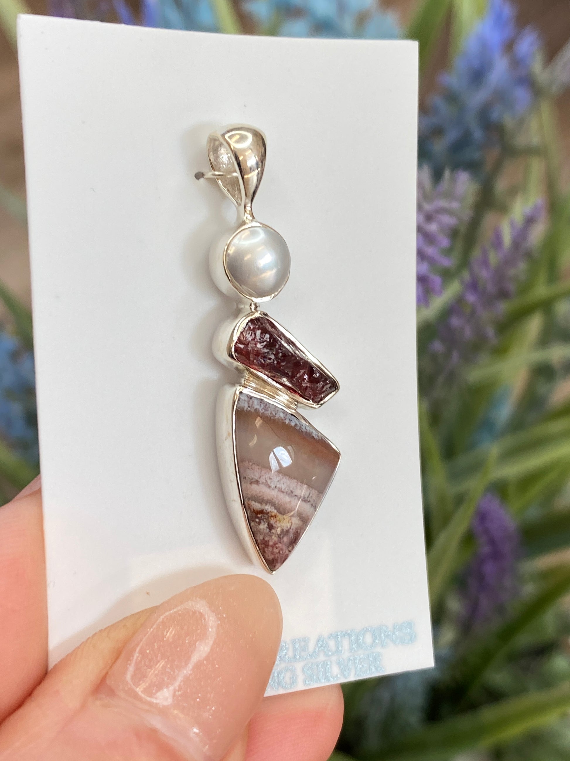 Garnet, Pearl, Crazy Lace Agate Pendant, .925 Sterling