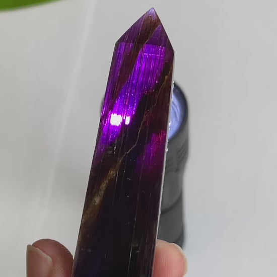 This is a lovely Gem Lepidolite tower at an excellent price point for this material. In Gem Lepidolite, the sheets of mica are very finely stacked creating a transparent, gemmy appearance when backlit. A difficult material to source and to polish. A beautiful piece for any collection. You will receive the exact Gem Lepidolite shown.