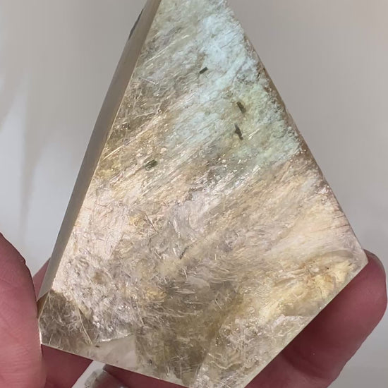 Beautiful, uncommon Gold Mica with silvery-blue flash like a moonstone. These are gem quality, meaning the layers of Mica are fine enough and tightly spaced so that it appears translucent when backlit. You will receive the exact Gold Mica shown. Mica is a lustrous, shimmering mineral with a variety of uses. Associated with abundance, confidence, and manifestation. Mica encourages self-reflection, emotional balance, and spiritual growth. Beneficial to all chakras.