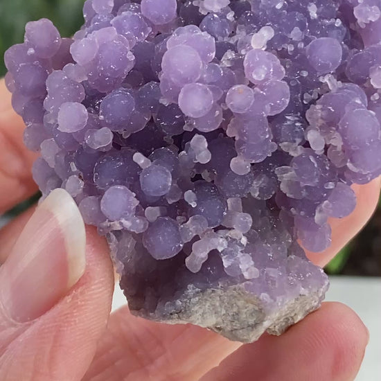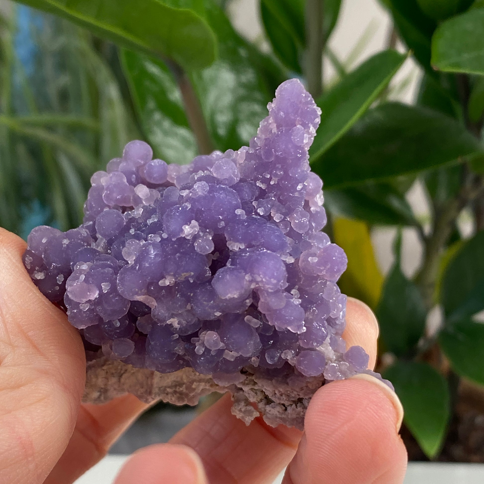 This is a unique, shimmery Grape Agate specimen. Grape Agate is a type of purple Chalcedony coming from just one location in Indonesia. An uncommon and enchanting crystal, Grape Agate is a powerful Third Eye stone & activates the crown Chakra, aiding intuition and allowing spiritual knowledge to find us. A stone for spiritual and earthy abundance, growth & fruitfulness. Used to heal both the body and spirit. Boosts energy as well as creativity while still being a calming stone overall.