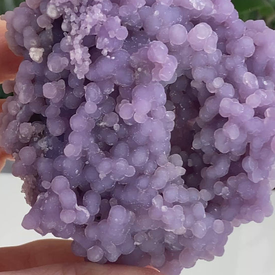 This is a unique, purple Grape Agate specimen. Grape Agate is a type of purple Chalcedony coming from just one location in Indonesia. An uncommon and enchanting crystal, Grape Agate is a powerful Third Eye stone & activates the crown Chakra, aiding intuition and allowing spiritual knowledge to find us. A stone for spiritual and earthy abundance, growth & fruitfulness. Used to heal both the body and spirit. Boosts energy as well as creativity while still being a calming stone overall.