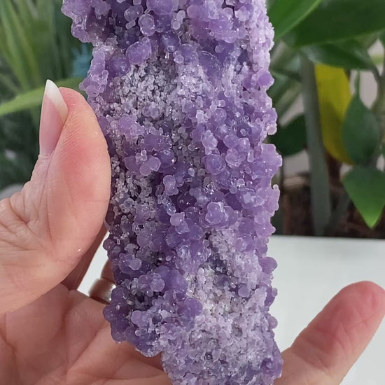 This is a unique, purple Grape Agate specimen. Nice shimmer. Grape Agate is a type of purple Chalcedony coming from just one location in Indonesia. An uncommon and enchanting crystal, Grape Agate is a powerful Third Eye stone & activates the crown Chakra, aiding intuition and allowing spiritual knowledge to find us. A stone for spiritual and earthy abundance, growth & fruitfulness. Used to heal both the body and spirit. Boosts energy as well as creativity while still being a calming stone overall.