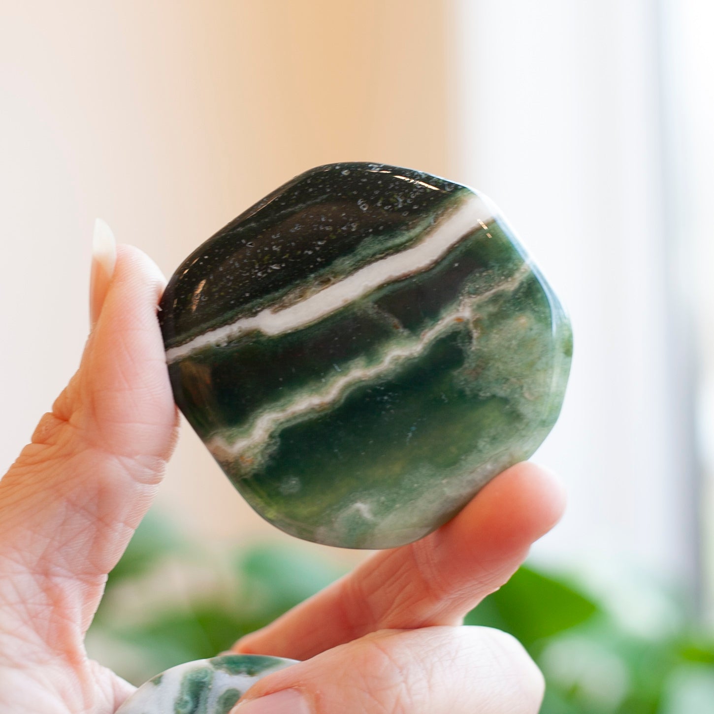 This listing is for one large Green Sardonyx stone from the lot shown. Green Sardonyx is an enchanting blend of Earth and Water Energies that emanates grounding energies that anchor the spirit. It symbolizes strength and balance, resonating with the heart and root chakras. Its harmonious bands reflect unity within the self. A talisman of courage, it mirrors the enduring vitality of nature. A stone of growth, prosperity and manifestation, Helps us to discover our own strength within the symphony of life.