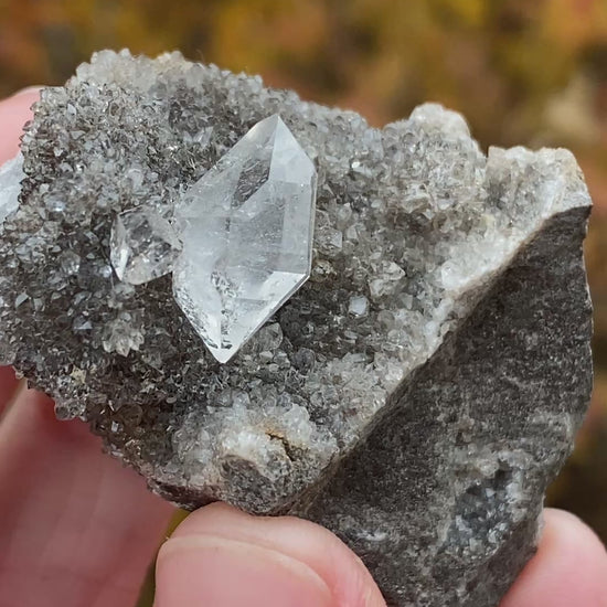 Very nice Herkimer Diamond in Matrix. These are perfectly intact Herkimer Diamond crystal in the natural matrix. Perfect little specimen! This is some older stock I got from the person who collected them at Ace of Diamonds in Middlefield, NY. A great deal for such a lovely piece. You will receive the exact crystal shown. The matrix is lovely too, with fine second-generation quartz growth and some tiny Herkimers.