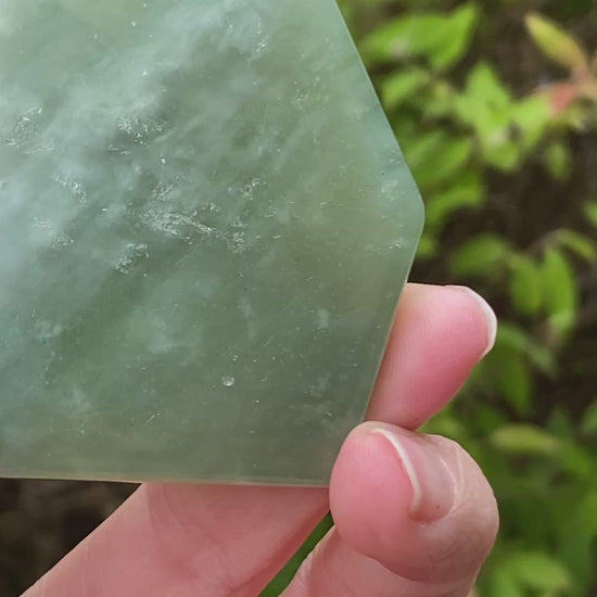 A lovely natural Jade slab. This green Jade has been handcut and has wonderful color with a bit of transparency. You will receive the exact Jade stone shown. Jade has a long history of being stone that symbolizes love and fidelity. It is ideal for newlywed couples and those looking to bring new, long-term love into their lives. Jade is also a wonderful stone for Gardeners, as it is a refreshing & nurturing stone. Jade's green shades invoke the healing and relaxing qualities of Nature.