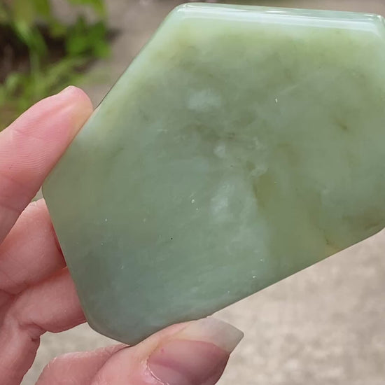 A lovely natural Jade slab. This green Jade has been handcut and has wonderful color with a bit of transparency. You will receive the exact Jade stone shown. Jade has a long history of being stone that symbolizes love and fidelity. It is ideal for newlywed couples and those looking to bring new, long-term love into their lives. Jade is also a wonderful stone for Gardeners, as it is a refreshing & nurturing stone. Jade's green shades invoke the healing and relaxing qualities of Nature.