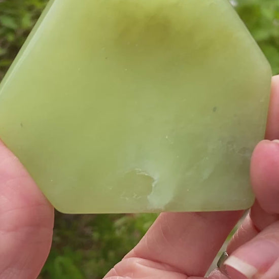 A lovely natural Jade slab. This green Jade has been handcut and has wonderful color with a bit of transparency. You will receive the exact Jade stone shown. Jade has a long history of being stone that symbolizes love and fidelity. It is ideal for newlywed couples and those looking to bring new, long-term love into their lives. Jade is also a wonderful stone for Gardeners, as it is a refreshing & nurturing stone. Jade's green shades invoke the healing and relaxing qualities of Nature.