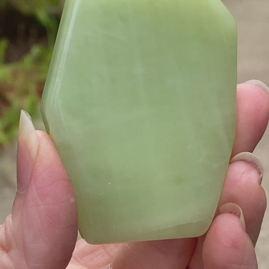 A lovely natural Jade slab. This green Jade has been handcut and has wonderful color with a bit of transparency. You will receive the exact Jade stone shown. Jade has a long history of being stone that symbolizes love and fidelity. It is ideal for newlywed couples and those looking to bring new, long-term love into their lives. Jade is also a wonderful stone for Gardeners, as it is a refreshing & nurturing stone. Jade's green shades invoke the healing and relaxing qualities of Nature.