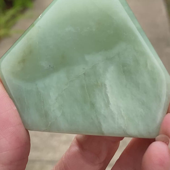 A lovely natural Jade slab. This green Jade has been handcut and has wonderful color with a bit of transparency. You will receive the exact Jade stone shown. Jade has a long history of being stone that symbolizes love and fidelity. It is ideal for newlywed couples and those looking to bring new, long-term love into their lives. Jade is also a wonderful stone for Gardeners, as it is a refreshing & nurturing stone. Jade's green shades invoke the healing and relaxing qualities of Nature.
