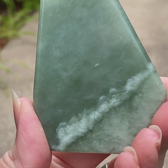 A lovely natural Jade slab. This green Jade has been handcut and has wonderful color with a bit of transparency. You will receive the exact Jade stone shown. Jade has a long history of being stone that symbolizes love and fidelity. It is ideal for newlywed couples and those looking to bring new, long-term love into their lives. Jade is also a wonderful stone for Gardeners, as it is a refreshing & nurturing stone. Jade's green shades invoke the healing and relaxing qualities of Nature.