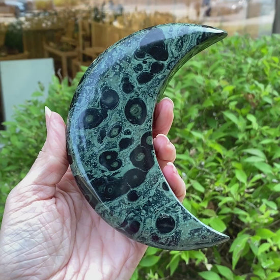 This is a large, Kambaba Jasper moon carving. Very nice quality Kambaba Jasper with deep green color and wild orbs. You will receive the exact crescent moon carving shown.
