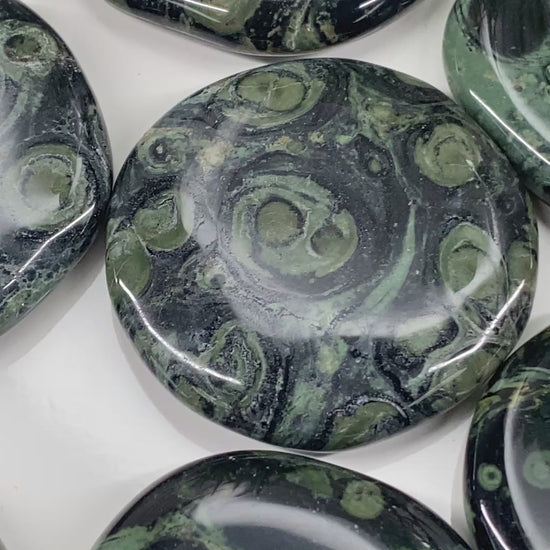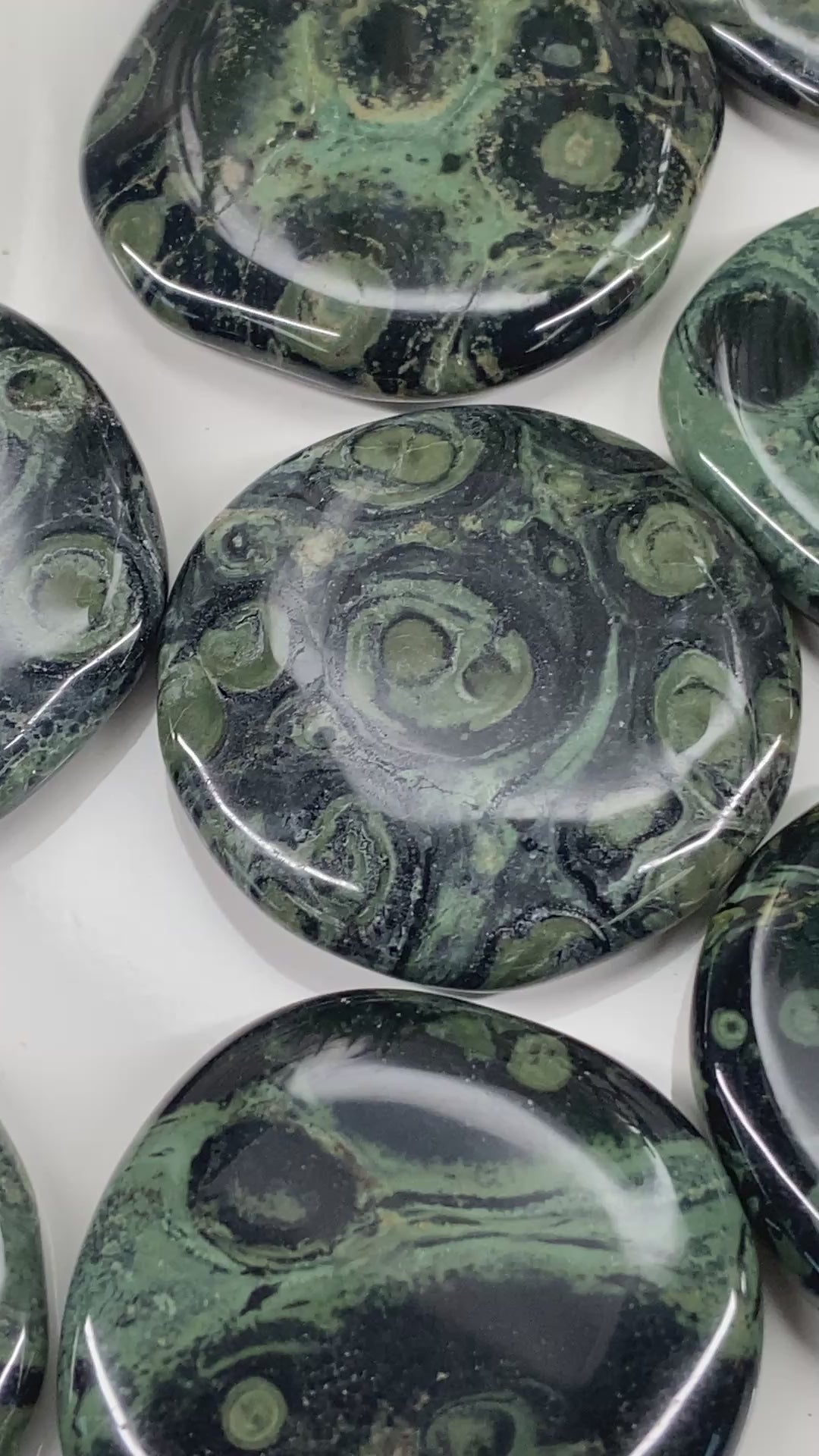Lovely, natural Kambaba Jasper Palm Stones. Hand-cut and polished pieces. A larger, round worry stone shape. These have been cherry picked for color and orb definition. You will receive one Kambaba Jasper from the lot shown.