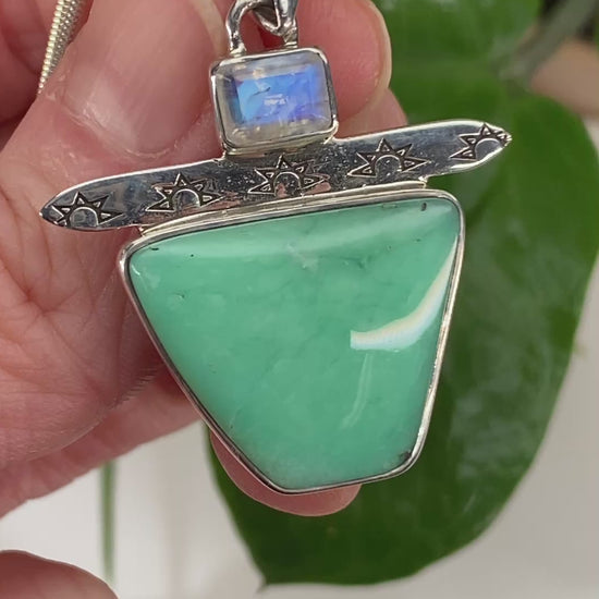 Unique Kingman Turquoise Pendant topped with a flashy rainbow moonstone. A beautiful, handmade piece with high-quality stones. You will receive the exact pendant shown, a gift box and a meaning card. Chain and pendant are both Solid .925 Sterling Silver.