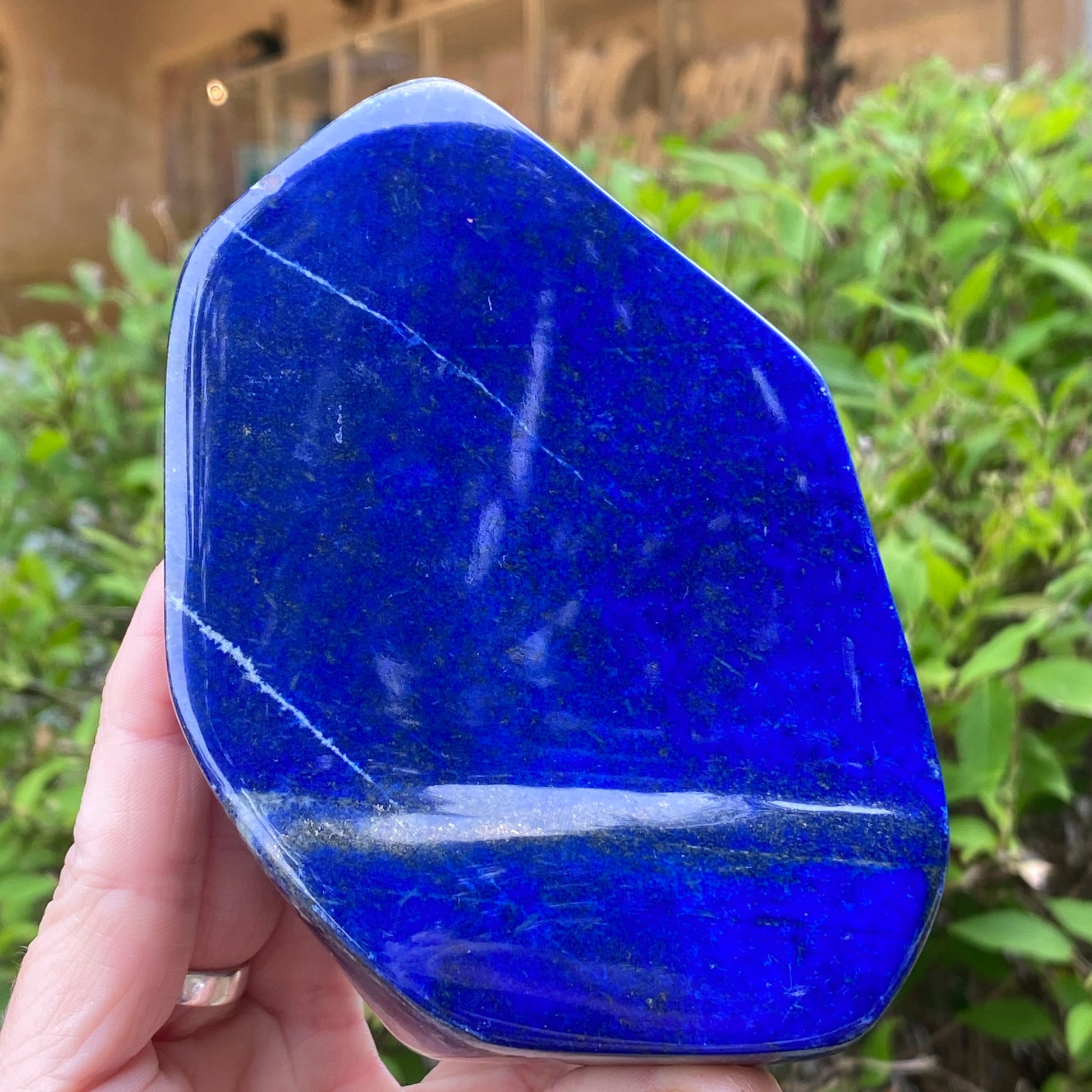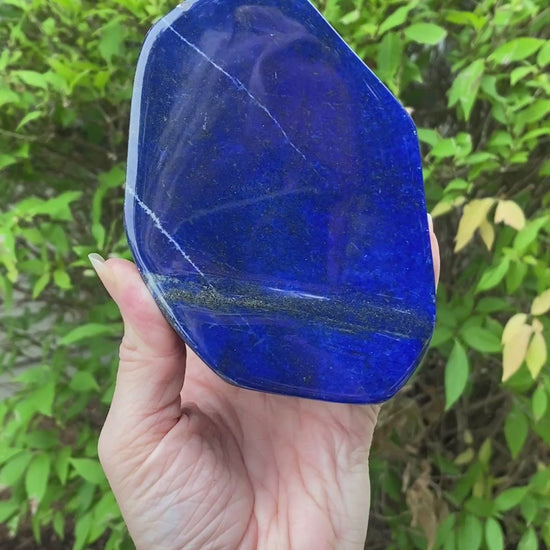 Gorgeous! This is a high quality Lapis Lazuli freeform with intense blue color. Distinctive streaks of Pyrite in Royal Blue Lapis Lazuli. A very thick, double sided piece with excellent color on both sides. Can be displayed either side. This is totally natural Lapis Lazuli from a Grade A batch. Somewhat unusual to have the higher grade Lapis in such large cuts. Self-Stands for display.