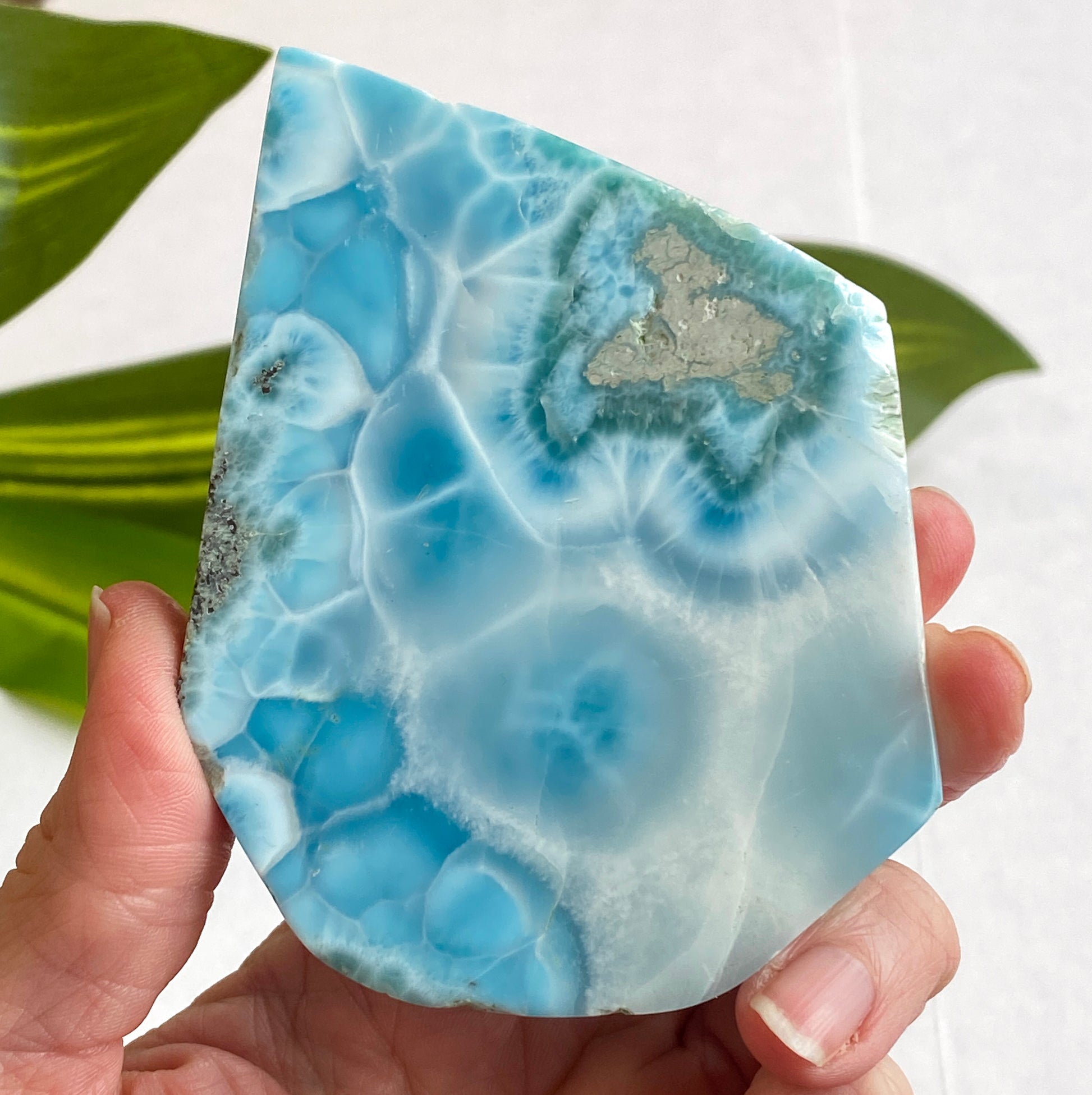 A beautiful, self-standing slab of Larimar. Very nice quality with some translucent areas. Stands the way shown in the first picture. From the Tucson Gem Show 2026. You will receive the exact Larimar shown. This beautiful stone hails from the Dominican Republic. Larimar embodies the tranquil sea and ethereal heavens. Larimar is said to enlighten and heal on all physical, emotional, mental and spiritual levels. It supports the heart, throat, third eye and crown chakras. A stone of manifestation, mental clarity, calming and stress relief. Both soothing and empowering. Larimar is an excellent stone for confidence, overcoming obstacles and finding one's true path.