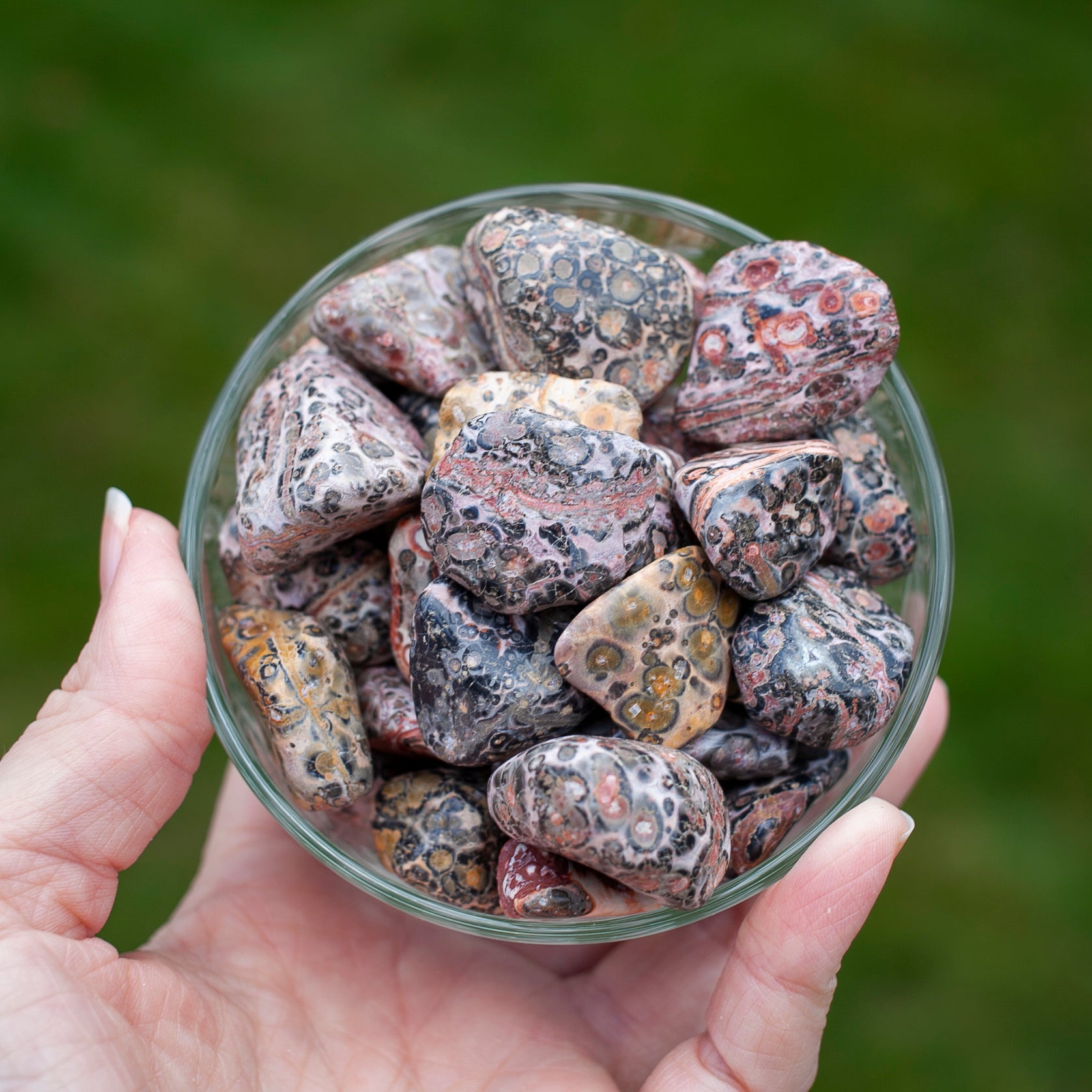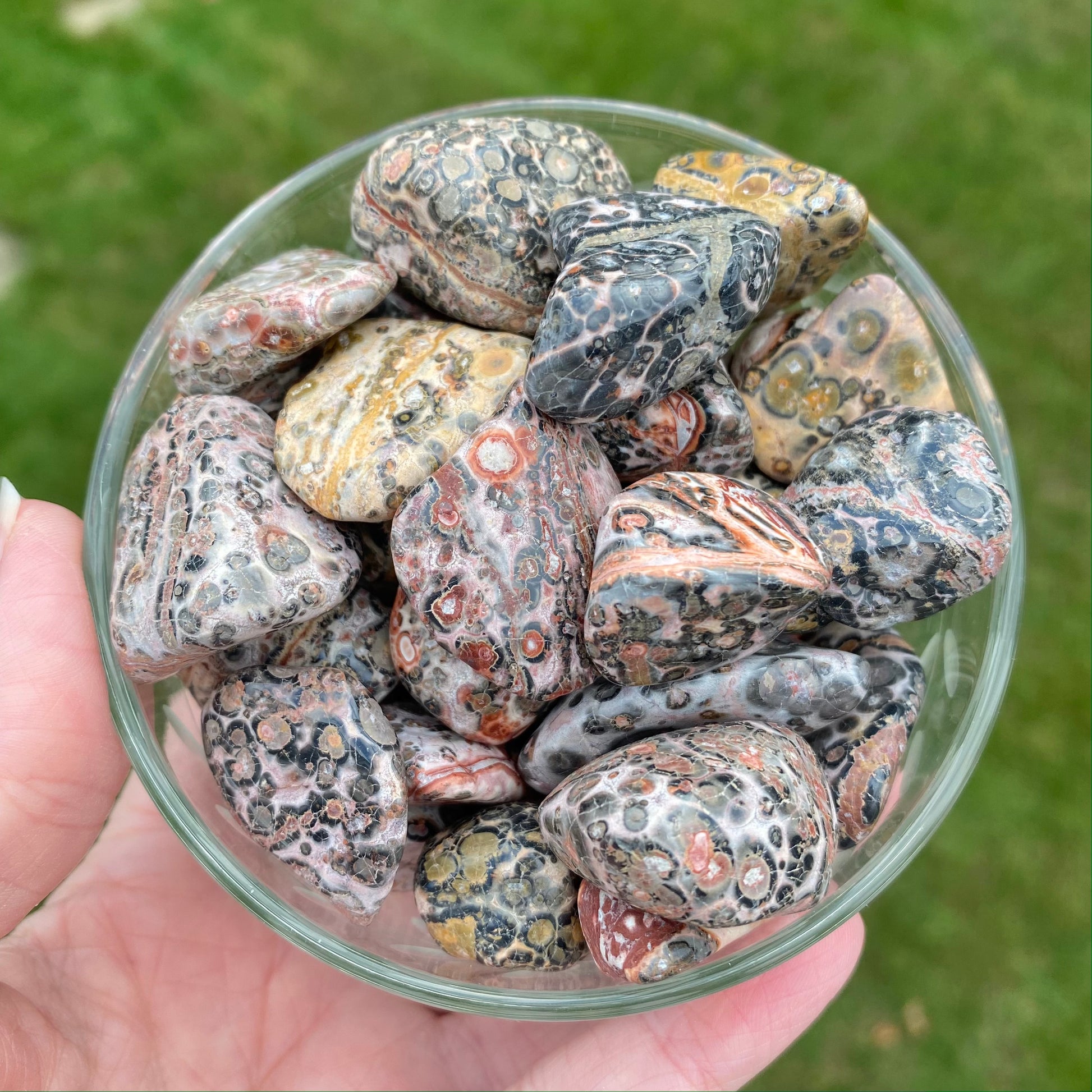 This listing is for one Leopard Skin Jasper stone with warm colors and wild patterns like paint. You can actually feel the texture of the black circles, like holding nature's artwork. Colors range from sandy gold to light pink. Each stone measures about .75" - 1.25" so a nice medium-large stone. A few smaller round stones, but all the stones from this batch are very lovely, so you can't go wrong. All Jasper has wonderful Earth energy and a comforting, grounding energy. Leopardskin Jasper is thought to inspire creativity and imagination. A nice stone for Artists, but really for anyone looking for a little inspiration.