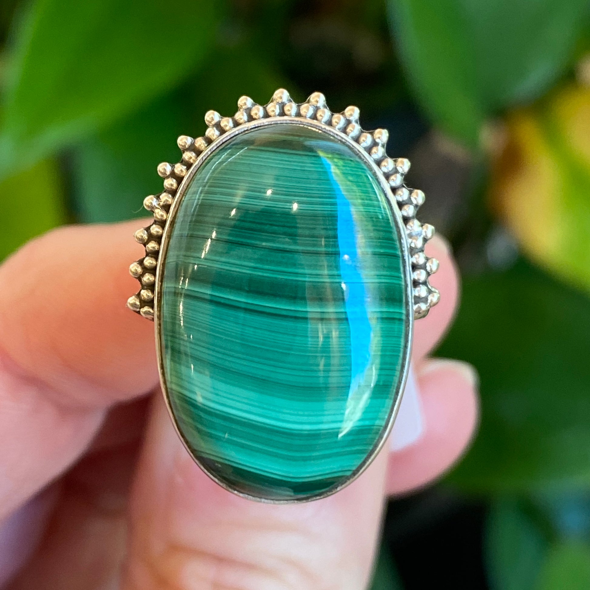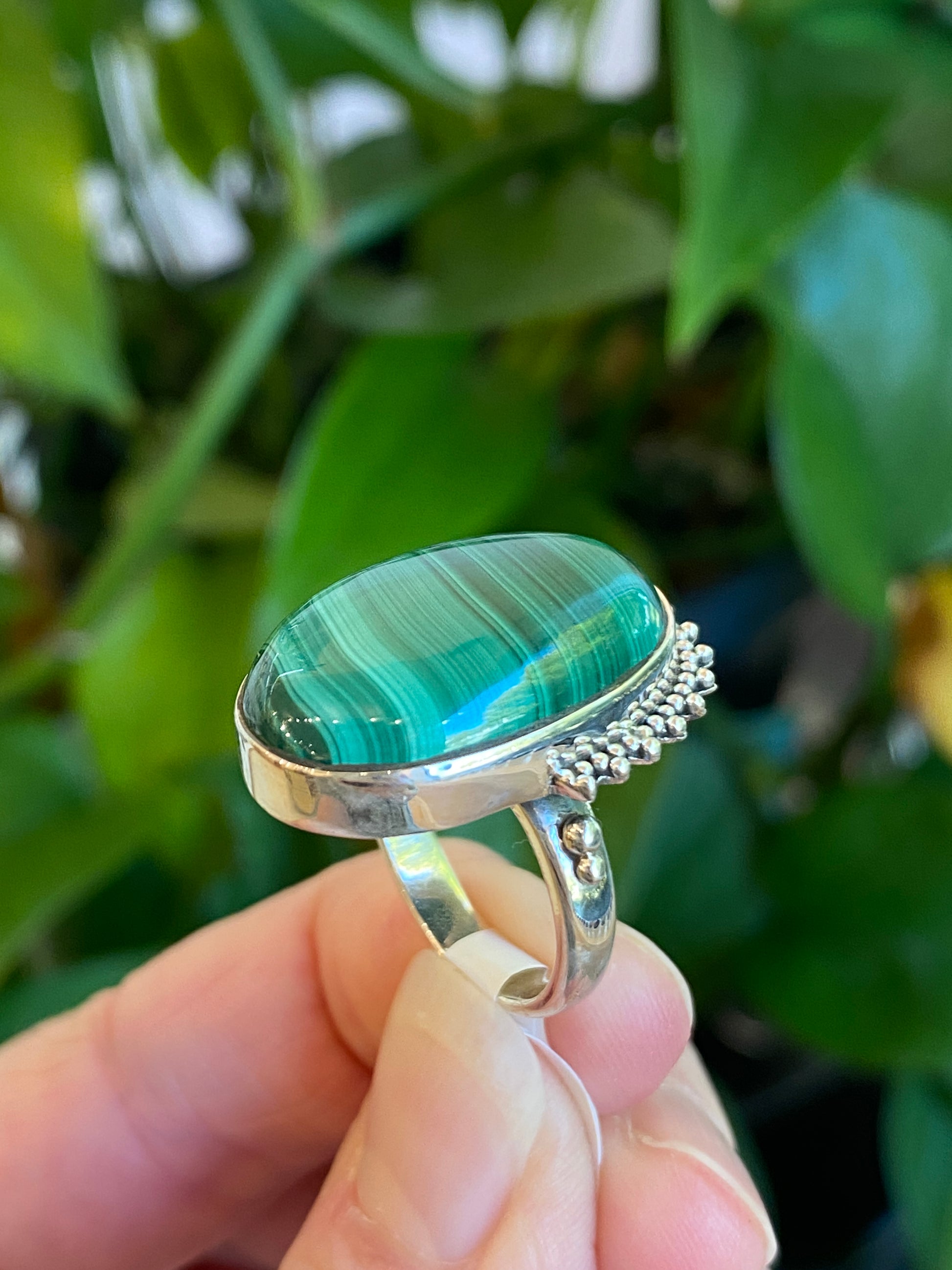 This is a beautiful Malachite ring made with a larger, natural Malachite stone and set in .925 sterling silver. One of a kind! You will receive the exact ring shown. Malachite is a stone of prosperity and manifestation, accelerating personal and spiritual growth. Malachite's high copper content and receptivity make it a wonderful tool for channeling negative energy and ailments away from the body.